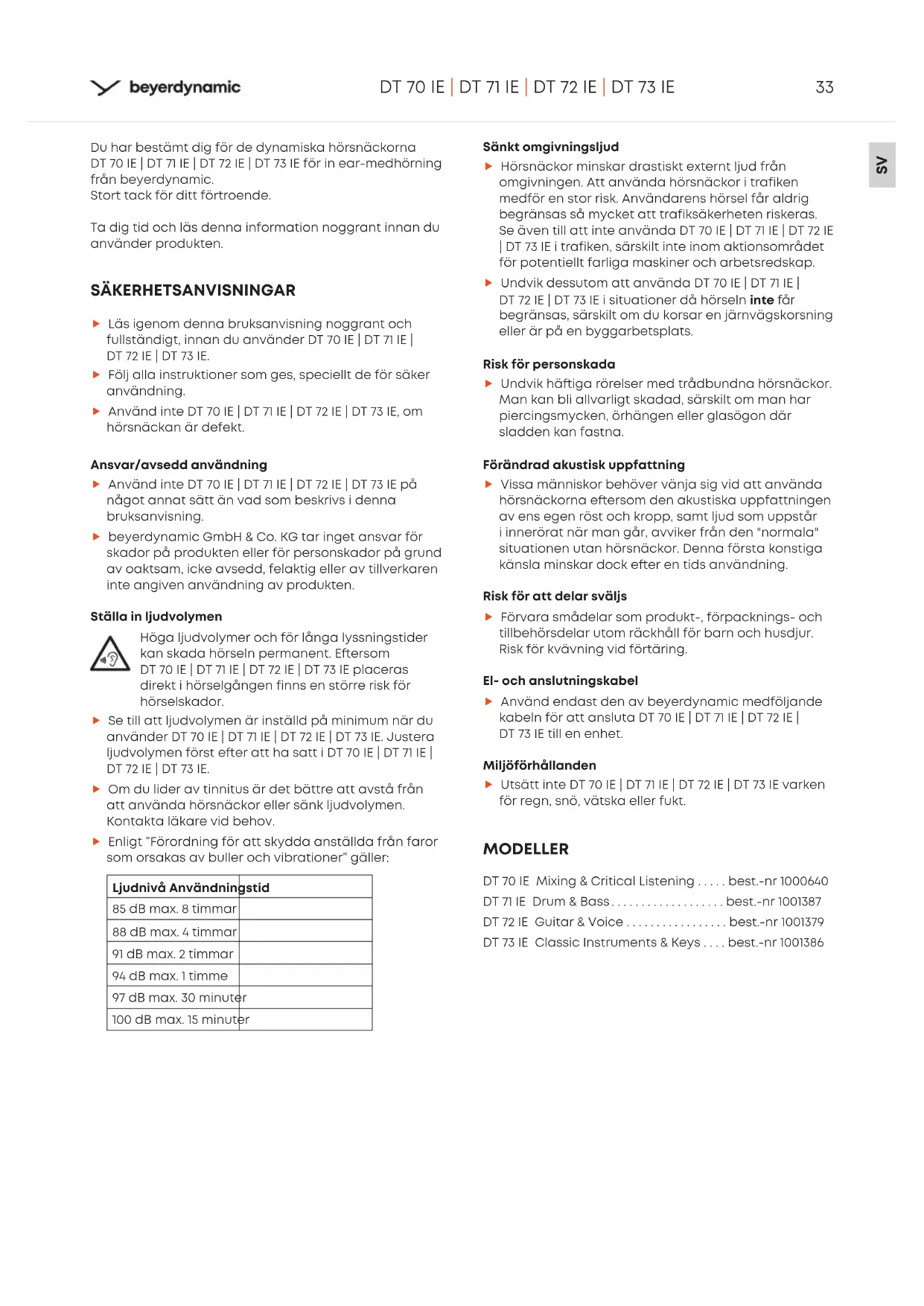 DT 70 IE | DT 71 IE | DT 72 IE | DT 73 IE Du har beämt dig för de dynamiska hörsnäckorna DT 70 IE | DT 71 IE | DT 72 IE | DT 73 IE för in ear-medhörning från beyerdynamic. Sto tack för ditt föroende. Ta dig tid och läs denna information noggrant innan du använder produkten. SÄKERHETSANVISNINGAR Läs igenom denna bruksanvisning noggrant och fulländigt, innan du använder DT 70 IE | DT 71 IE | DT 72 IE | DT 73 IE. Följ alla inruktioner som ges, speciellt de för säker användning. Använd inte DT 70 IE | DT 71 IE | DT 72 IE | DT 73 IE, om hörsnäckan är defekt. Ansvar/avsedd användning Använd inte DT 70 IE | DT 71 IE | DT 72 IE | DT 73 IE på något annat sätt än vad som beskrivs i denna bruksanvisning. beyerdynamic GmbH & Co. KG tar inget ansvar för skador på produkten eller för personskador på grund av oaktsam, icke avsedd, felaktig eller av tillverkaren inte angiven användning av produkten. Ställa in ljudvolymen Höga ljudvolymer och för långa lyssningider kan skada hörseln permanent. Eersom DT 70 IE | DT 71 IE | DT 72 IE | DT 73 IE placeras direkt i hörselgången finns en örre risk för hörselskador. Se till att ljudvolymen är inälld på minimum när du använder DT 70 IE | DT 71 IE | DT 72 IE | DT 73 IE. Juera ljudvolymen för eer att ha satt i DT 70 IE | DT 71 IE | DT 72 IE | DT 73 IE. Om du lider av tinnitus är det bättre att avå från att använda hörsnäckor eller sänk ljudvolymen. Kontakta läkare vid behov. Enligt ”Förordning för att skydda anällda från faror som orsakas av buller och vibrationer” gäller: Ljudnivå Användningid 85 dB max. 8 timmar 88 dB max. 4 timmar 91 dB max. 2 timmar 94 dB max. 1 timme 97 dB max. 30 minuter 100 dB max. 15 minuter Sänkt omgivningsljud Hörsnäckor minskar draiskt externt ljud från omgivningen. Att använda hörsnäckor i trafiken medför en or risk. Användarens hörsel får aldrig begränsas så mycket att trafiksäkerheten riskeras. Se även till att inte använda DT 70 IE | DT 71 IE | DT 72 IE | DT 73 IE i trafiken, särskilt inte inom aktionsområdet för potentiellt farliga maskiner och arbetsredskap. Undvik dessutom att använda DT 70 IE | DT 71 IE | DT 72 IE | DT 73 IE i situationer då hörseln inte får begränsas, särskilt om du korsar en järnvägskorsning eller är på en byggarbetsplats. Risk för personskada Undvik häiga rörelser med trådbundna hörsnäckor. Man kan bli allvarligt skadad, särskilt om man har piercingsmycken, örhängen eller glasögon där sladden kan fana. Förändrad akuisk uppfattning Vissa människor behöver vänja sig vid att använda hörsnäckorna eersom den akuiska uppfattningen av ens egen rö och kropp, samt ljud som uppår i innerörat när man går, avviker från den "normala" situationen utan hörsnäckor. Denna föra koniga känsla minskar dock eer en tids användning. Risk för att delar sväljs Förvara smådelar som produkt-, förpacknings- och tillbehörsdelar utom räckhåll för barn och husdjur. Risk för kvävning vid föäring. El- och anslutningskabel Använd enda den av beyerdynamic medföljande kabeln för att ansluta DT 70 IE | DT 71 IE | DT 72 IE | DT 73 IE till en enhet. Miljöförhållanden Utsätt inte DT 70 IE | DT 71 IE | DT 72 IE | DT 73 IE varken för regn, snö, vätska eller fukt. MODELLER DT 70 IE Mixing & Critical Liening .....be.-nr 1000640 DT 71 IE Drum & Bass ...................be.-nr 1001387 DT 72 IE Guitar & Voice .................be.-nr 1001379 DT 73 IE Classic Inruments & Keys ....be.-nr 100138634