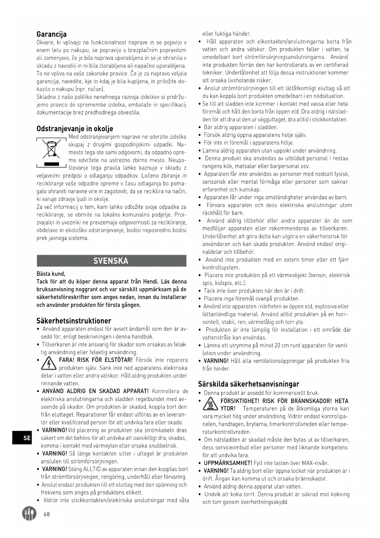 zvajalci in uvozniki ne prevzemajo odgovornosti za recikliranje, obdelavo in ekološko odstranjevanje, bodisi neposredno bodisi prek javnega sistema. SVENSKA Bästa kund, Tack för att du köper denna apparat från Hendi. Läs denna bruksanvisning noggrant och var särskilt uppmärksam på de säkerhetsföreskrifter som anges nedan, innan du installerar och använder produkten för första gången. Säkerhetsinstruktioner