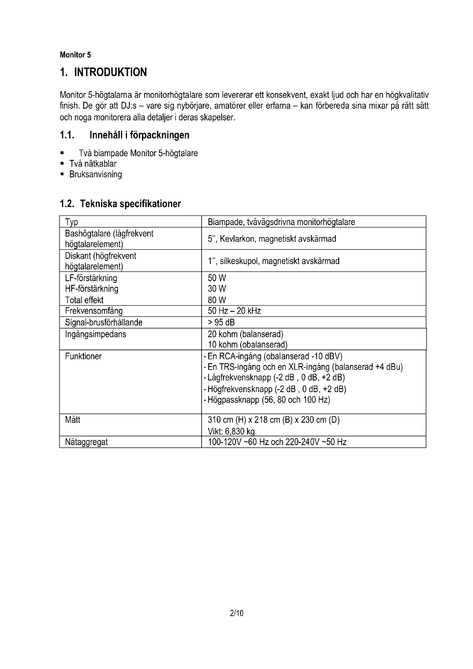Monitor 5-högtalarna är monitorhögtalare som levererar ett konsekvent, exakt ljud och har en högkvalitativ finish. De gör att DJ:s – vare sig nybörjare, amatörer eller erfarna – kan förbereda sina mixar på rätt sätt och noga monitorera alla detaljer i deras skapelser. 1.1. Innehåll i förpackningen Två biampade Monitor 5-högtalare Två nätkablar Bruksanvisning 1.2. Tekniska specifikationer Typ Biampade, tvåvägsdrivna monitorhögtalare Bashögtalare (lågfrekvent högtalarelement) 5’’, Kevlarkon, magnetiskt avskärmad Diskant (högfrekvent högtalarelement) 1’’, silkeskupol, magnetiskt avskärmad LF-förstärkning HF-förstärkning Total effekt 50 W 30 W 80 W Frekvensomfång 50 Hz – 20 kHz Signal-brusförhållande > 95 dB Ingångsimpedans 20 kohm (balanserad) 10 kohm (obalanserad) Funktioner - En RCA-ingång (obalanserad -10 dBV) - En TRS-ingång och en XLR-ingång (balanserad +4 dBu) - Lågfrekvensknapp (-2 dB , 0 dB, +2 dB) - Högfrekvensknapp (-2 dB , 0 dB, +2 dB) - Högpassknapp (56, 80 och 100 Hz) Mått 310 cm (H) x 218 cm (B) x 230 cm (D) Vikt: 6,830 kg Nätaggregat 100-120V ~60 Hz och 220-240V ~50 HzMonitor 5 3/10 1.3. Rekommendationer - Sätt högtalarna på en plan yta för att undvika risken att högtalarna välter. - Öppna aldrig högtalarna eftersom du riskerar att skada de inre komponenterna. - Dessa högtalare är avsedda att användas i en tempererad miljö. - För att förhindra risken för brand eller elektrisk urladdning ska du hålla högtalarna borta från: - regn eller fuktighet samt alla vätskor (vatten, kemiska produkter eller andra vätskor), - värmekällor som värmeelement, spisar eller andra värmeproducerande anordningar (inklusive förstärkare), - direkt solljus. - Droppa och skvätt inte vatten på högtalarna. - Ställ aldrig föremål fyllda med vätska (ett glas, en vas...) på högtalarna. - Inga föremål med öppen eld, som t.ex. tända stearinljus, får ställas på enheterna. - Stäng av högtalarna om du inte tänker använda dem under längre perioder. - Stäng av högtalarna innan du rengör dem. Använd en fuktig trasa och undvik att använda aerosolbaserade rengöringsmedel. - Produktmärkningar sitter på baksidan av högtalarna. - Byt ut tillbehören i enlighet med specifikationerna från tillverkaren eller dennes auktoriserade representant. - Denna produkt innehåller inga interna delar som kan repareras av användaren. Underhåll måste utföras av tillverkaren eller dennes auktoriserade representant. - Obs: På högsta volym kan långvarigt lyssnande med hörlurar resultera i hörselskador.Monitor 5 4/10