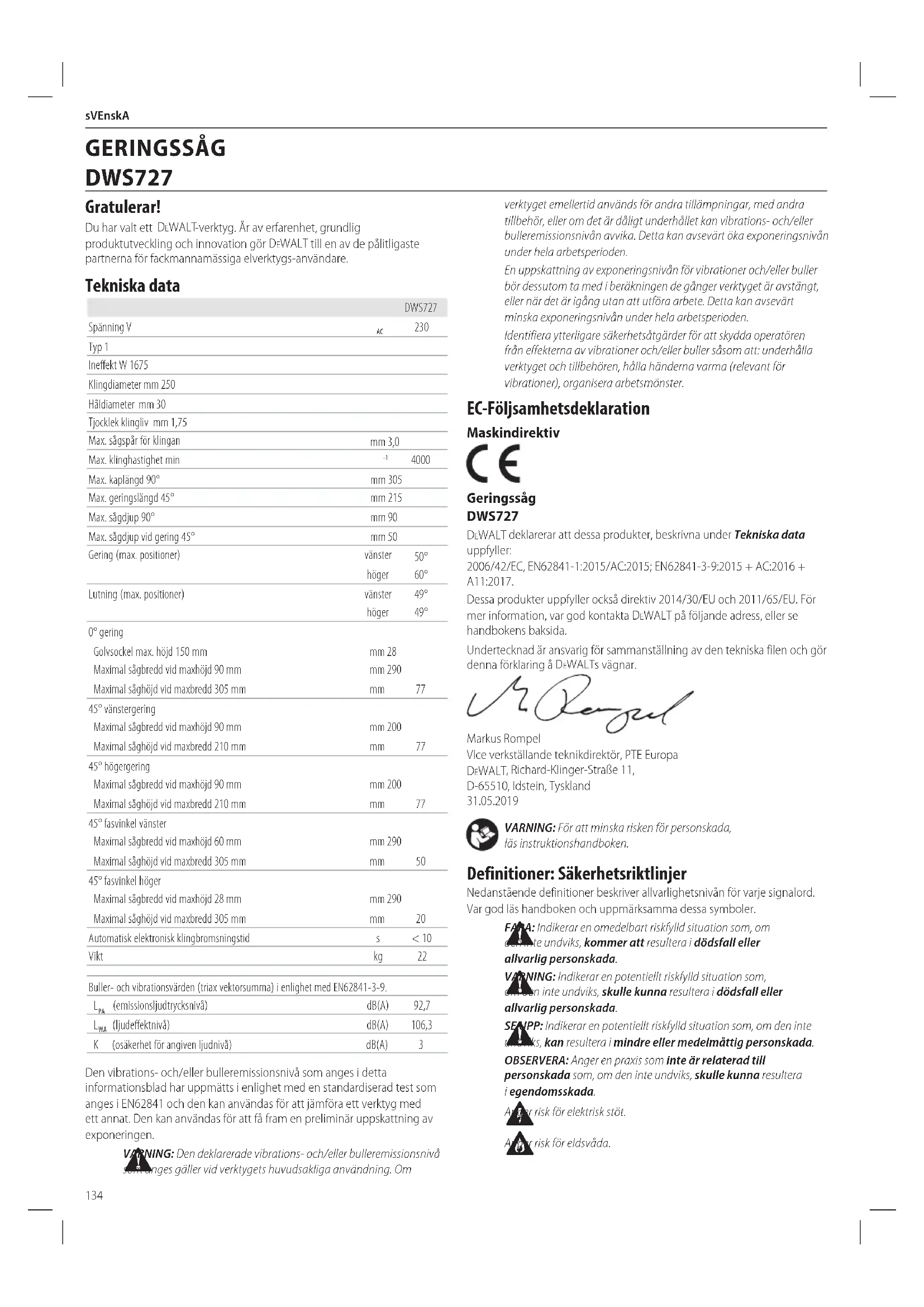 Anger risk föreldsvåda. EC-Följsamhetsdeklaration Maskindirektiv Geringssåg DWS727 DeWALT deklarerar att dessa produkter, beskrivna under Tekniska data uppfyller: 2006/42/EC, EN62841-1:2015/AC:2015; EN62841-3-9:2015 + AC:2016 + A11:2017. Dessa produkter uppfyller också direktiv 2014/30/EU och 2011/65/EU. För mer information, var god kontakta DeWALT på följande adress, eller se handbokensbaksida. Undertecknad är ansvarig för sammanställning av den tekniska filen och gör denna förklaring å DeWALT svägnar. Markus Rompel VIce verkställande teknikdirektör, PTE Europa DeWALT , Richard-Klinger-Straße 11, D-65510, Idstein, Tyskland
