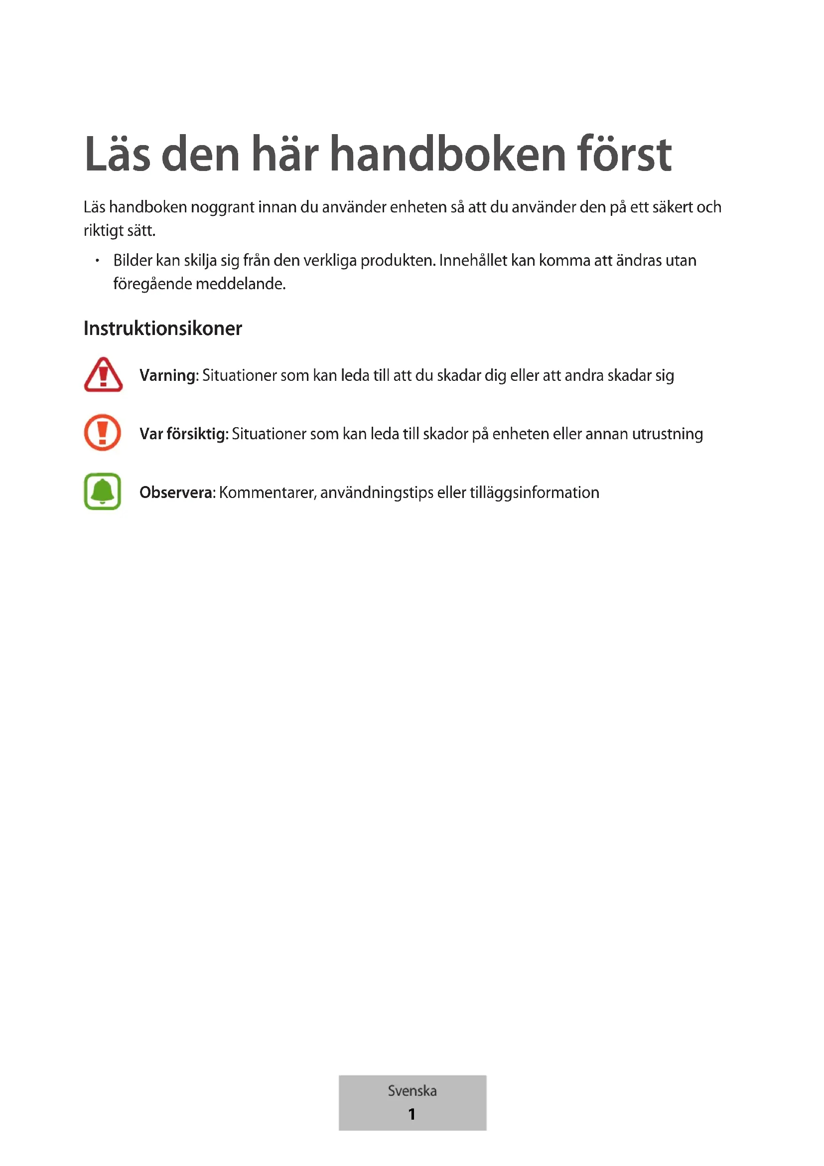 Bilder kan skilja sig från den verkliga produkten. Innehållet kan komma att ändras utan föregående meddelande. Instruktionsikoner Varning: Situationer som kan leda till att du skadar dig eller att andra skadar sig Var försiktig: Situationer som kan leda till skador på enheten eller annan utrustning Observera: Kommentarer, användningstips eller tilläggsinformation Svenska