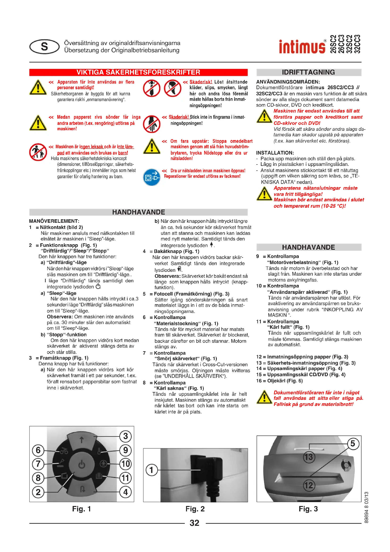 For-sikring (treg): 220-240V = 10 A / 120V = 15 AVIKTIGA SÄKERHETSFÖRESKRIFTER << Skaderisk! Löst åtsittande kläder, slips, smycken, långt hår och andra lösa föremål måste hållas borta från inmat-ningsöppningen!<< Skaderisk! -ningsöppningen! maskinen genom att slå från huvudström- brytaren, trycka Nödstopp eller dra ur nätsladden!<< Dra ur nätsladden innan maskinen öppnas! Reparationer får endast utföras av fackman! << Apparaten får inte användas av flera personer samtidigt! Säkerhetsorganen är byggda för att kunna garantera riskfri „enmansmanövrering“. maskinen!<< ingen leksak och är inte läm-pad att användas och brukas av barn! Hela maskinens säkerhetstekniska koncept (dimensioner, tillförselöppningar, säkerhets-frånkopplingar etc.) innehåller inga som helst garantier för ofarlig hantering av barn.Dokumentförstörare intimus 26SC2/CC3 // 32SC2/CC3 är en maskin vars funktion är att skära sönder av alla slags dokument samt datamedia som CD-skivor, DVD och kreditkort.Maskinen får endast användas till att förstöra papper och kreditkort samt CD-skivor och DVD!Vid försök att skära sönder andra slags da-tamedia kan skador uppstå på apparaten (t.ex. kan skärverket etc. förstöras).- Packa upp maskinen och ställ den på plats. - Lägg in plastsäcken i uppsamlingslådan.- Anslut maskinens stickkontakt till ett nätuttag (uppgift om vilken säkring som krävs, se „TE-KNISKA DATA“ nedan).Apparatens nätanslutningar måste vara fritt tillgängliga!Maskinen bör endast användas i slutet och tempererat rum (10-25 °C)!9 = Kontrollampa Tänds när motorn är överbelastad och har slagit från. Maskinen kan inte startas under motorns avkylningsfas.10 = Kontrollampa Tänds när användarspärren har utlöst. För avaktivering av användarspärren se bruks-anvisning under rubrik “INKOPPLING AV MASKIN “.11 = Kontrollampa Tänds när uppsamlingskärlet är fullt och måste tömmas. Samtidigt stängs maskinen av automatiskt.Dokumentförstöraren får inte i något fall användas att sitta eller stiga på. Fallrisk på grund av materialbrott!1 = Nätkontakt (bild 2) När maskinen ansluts med nätkontakten till elnätet är maskinen i ”Sleep”-läge. Den här knappen har tre funktioner: När den här knappen vidrörs i ”Sleep“-läge slås maskinen om till “Driftfärdig”-läge.. I läge “Driftfärdig“ tänds samtidigt den integrerade lysdioden . När den här knappen hålls intryckt i ca.3 sekunder i läge “Driftfärdig“ slås maskinen om till ”Sleep“-läge. Om maskinen inte används på ca. 30 minuter slår den automatiskt om till “Sleep“-läge. Om den här knappen vidrörs kort medan skärverket är aktiverat stängs detta av och står stilla. Denna knapp har två funktioner: a) När den här knappen vidrörs kort kör skärverket framåt i ett par sekunder, t.ex. för att rensa bort pappersbitar som fastnat inne i skärverket. b) När den här knappen hålls intryckt längre än ca. två sekunder kör skärverket framåt utan att stanna och maskinen kan laddas med nytt material. Samtidigt tänds den integrerade lysdioden . När den här knappen vidrörs backar skär-verket Samtidigt tänds den integrerade lysdioden . Skärverket kör bakåt endast så länge som knappen hålls intryckt (knapp-funktion). Sätter igång sönderskärningen så snart materialet läggs in i ett av de båda inmat-ningsöppningarna.6 = Kontrollampa Tänds när för mycket material har matats fram till skärverket. Skärverket är blockerat, backar därefter en bit och stannar. Motorn stängs av.7 = Kontrollampa Tänds när skärverket i Cross-Cut-versionen måste smörjas. Oljningen måste kvitteras (se ”UNDERHÅLL SKÄRVERK“).8 = Kontrollampa Tänds när uppsamlingskärlet inte är helt inskjutet. Maskinen stängs av automatiskt när kärlet tas bort och kan inte starta om kärlet inte är på plats.