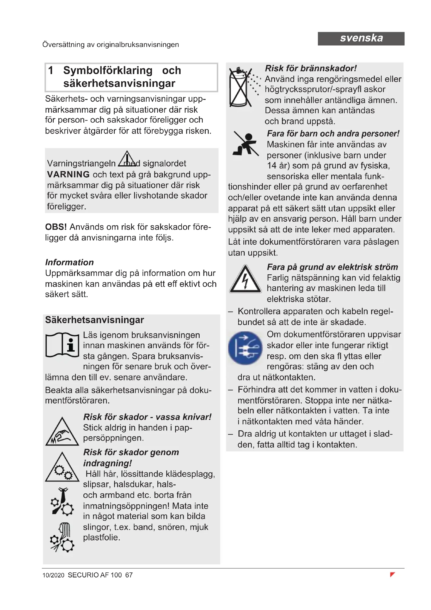 6–7 5–6 Vægt 7,6 kg Indføringsbredde 225 mm Skærehastighed 45 mm/s Tilslutning 220-240 V / 50/60 Hz 110-130 V / 50/60 Hz Eff ekt ved maks. antal ark 185 W (EU) / 160 W (US) Energiforbrug i standbymods < 2 Wh Driftstid maks. antal ark til 15 min Driftstid enkeltark til 20 min Omgivelsesbetingelser under driften: Temperatur Relativ luftfugtighed Højde over NN -10 °C til +25 °C Maks. 90 %, ikke-kondenserende Maks. 2.000 m Mål B x D x H (mm) 375 x 260 x 620 Materialebeholderens volumen 25 l Emissionslydtrykniveau (i tomgang/under belastning) 55-60 dB / 65-70 dB A-vurderet lydeff ektniveau (LWAd i tomgang) 71 dB10/2020 SECURIO AF 100 67 svenska Översättning av originalbruksanvisningen 1 Symbolförklaring och säkerhetsanvisningar Säkerhets- och varningsanvisningar upp- märksammar dig på situationer där risk för person- och sakskador föreligger och beskriver åtgärder för att förebygga risken. Information Uppmärksammar dig på information om hur maskinen kan användas på ett eff ektivt och säkert sätt. Varningstriangeln med signalordet VARNING och text på grå bakgrund upp- märksammar dig på situationer där risk för mycket svåra eller livshotande skador föreligger. OBS! Används om risk för sakskador före- ligger då anvisningarna inte följs. Säkerhetsanvisningar Läs igenom bruksanvisningen innan maskinen används för för- sta gången. Spara bruksanvis- ningen för senare bruk och över- lämna den till ev. senare användare. Beakta alla säkerhetsanvisningar på doku- mentförstöraren. Risk för skador - vassa knivar! Stick aldrig in handen i pap- persöppningen. Risk för skador genom indragning! Håll hår, lössittande klädesplagg, slipsar, halsdukar, hals- och armband etc. borta från inmatningsöppningen! Mata inte in något material som kan bilda slingor, t.ex. band, snören, mjuk plastfolie. Risk för brännskador! Använd inga rengöringsmedel eller högtryckssprutor/-sprayfl askor som innehåller antändliga ämnen. Dessa ämnen kan antändas och brand uppstå. Fara för barn och andra personer! Maskinen får inte användas av personer (inklusive barn under 14 år) som på grund av fysiska, sensoriska eller mentala funk- tionshinder eller på grund av oerfarenhet och/eller ovetande inte kan använda denna apparat på ett säkert sätt utan uppsikt eller hjälp av en ansvarig person. Håll barn under uppsikt så att de inte leker med apparaten. Låt inte dokumentförstöraren vara påslagen utan uppsikt. Fara på grund av elektrisk ström Farlig nätspänning kan vid felaktig hantering av maskinen leda till elektriska stötar. – Kontrollera apparaten och kabeln regel- bundet så att de inte är skadade. Om dokumentförstöraren uppvisar skador eller inte fungerar riktigt resp. om den ska fl yttas eller rengöras: stäng av den och dra ut nätkontakten. – Förhindra att det kommer in vatten i doku- mentförstöraren. Stoppa inte ner nätka- beln eller nätkontakten i vatten. Ta inte i nätkontakten med våta händer. – Dra aldrig ut kontakten ur uttaget i slad- den, fatta alltid tag i kontakten.68 SECURIO AF 100 10/2020 svenska 3 Översikt