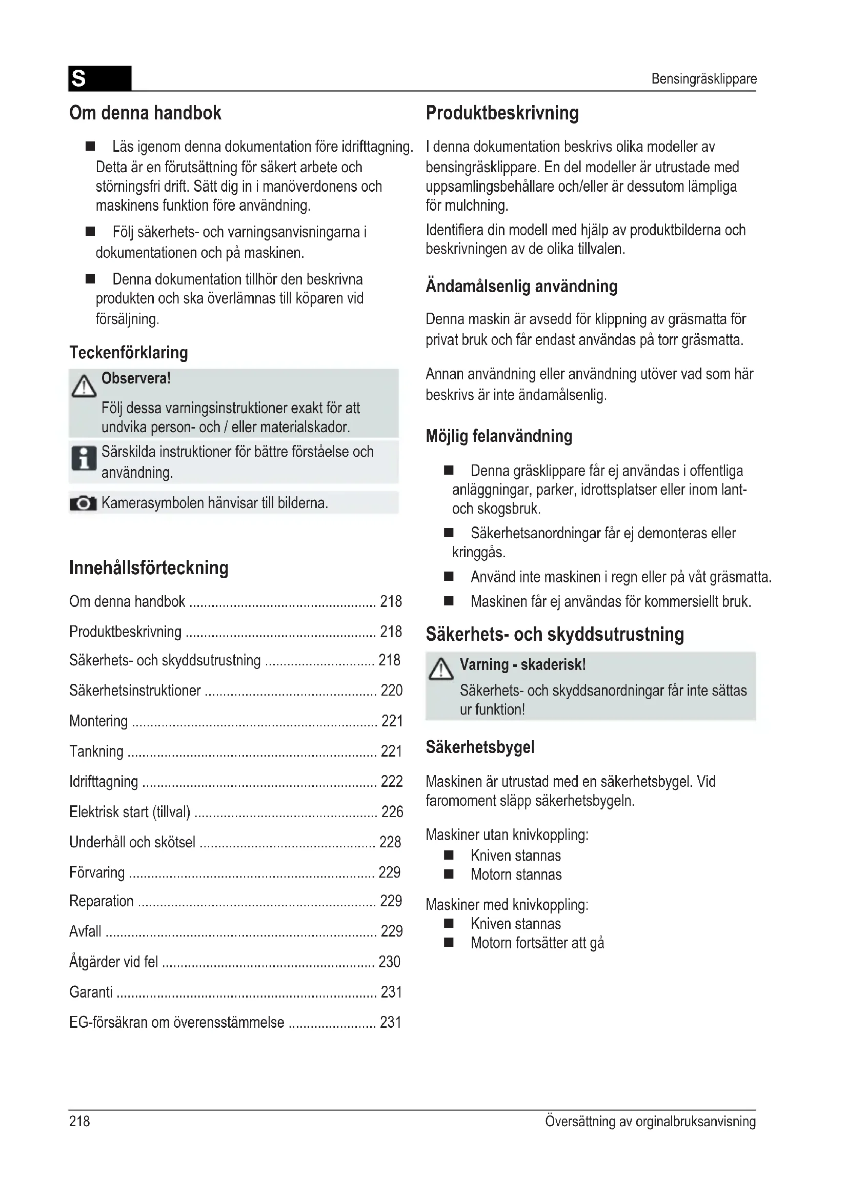 - Bensingräsklippare Innehållsförteckning Om denna handbok p. 218