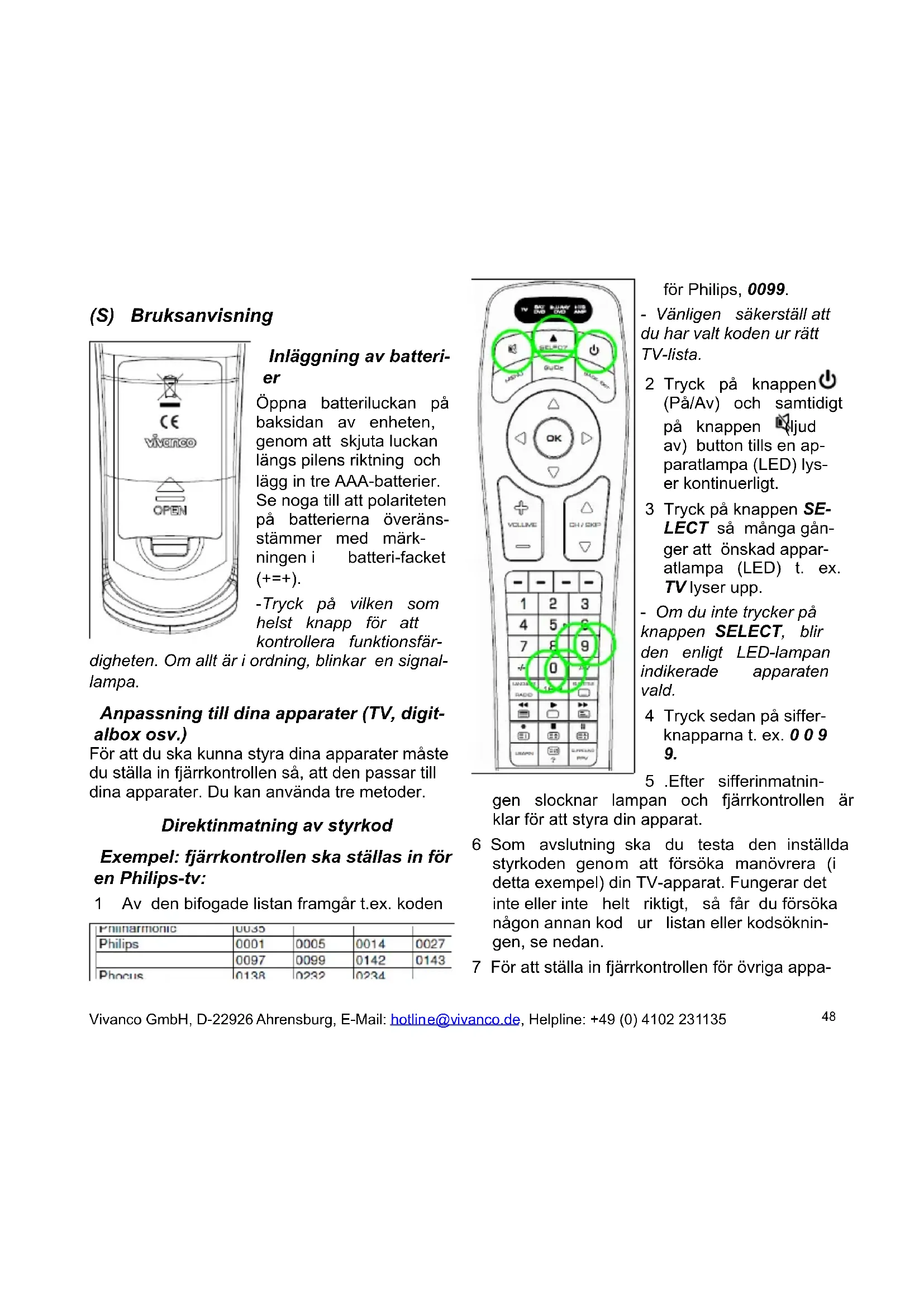 -Tryck på vilken som helst knapp för att kontrollera funktionsfär- digheten. Om allt är i ordning, blinkar en signal- lampa. Anpassning till dina apparater (TV, digit- albox osv.) För att du ska kunna styra dina apparater måste du ställa in fjärrkontrollen så, att den passar till dina apparater. Du kan använda tre metoder. Direktinmatning av styrkod Exempel: fjärrkontrollen ska ställas in för en Philips-tv: 1 Av den bifogade listan framgår t.ex. koden för Philips, 0099. - Vänligen säkerställ att du har valt koden ur rätt TV-lista. 2 Tryck på knappen (På/Av) och samtidigt på knappen (ljud av) button tills en ap- paratlampa (LED) lys- er kontinuerligt. 3 Tryck på knappen SE- LECT så många gån- ger att önskad appar- atlampa (LED) t. ex. TV lyser upp. - Om du inte trycker på knappen SELECT, blir den enligt LED-lampan indikerade apparaten vald. 4 Tryck sedan på siffer- knapparna t. ex. 0 0 9