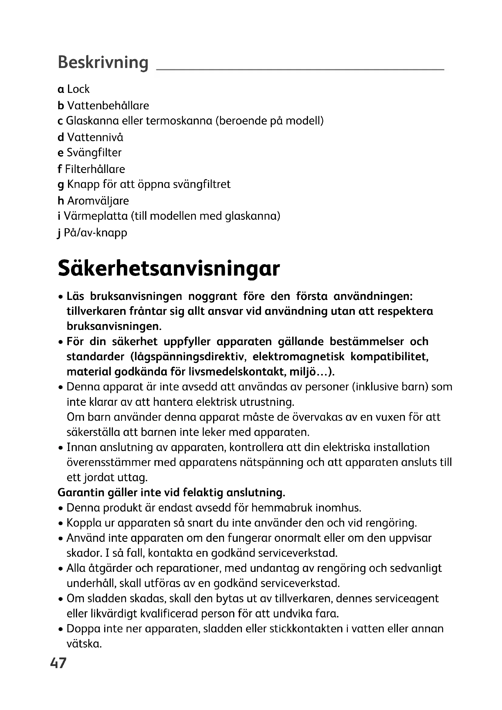 SM_COFFEE-MAKER-EXPRESS_Mise en page 1 20/05/11 14:43 Page46Beskrivning a Lock b Vattenbehållare c Glaskanna eller termoskanna (beroende på modell) d Vattennivå e Svängfilter f Filterhållare g Knapp för att öppna svängfiltret h Aromväljare i Värmeplatta (till modellen med glaskanna) j På/av-knapp Säkerhetsanvisningar