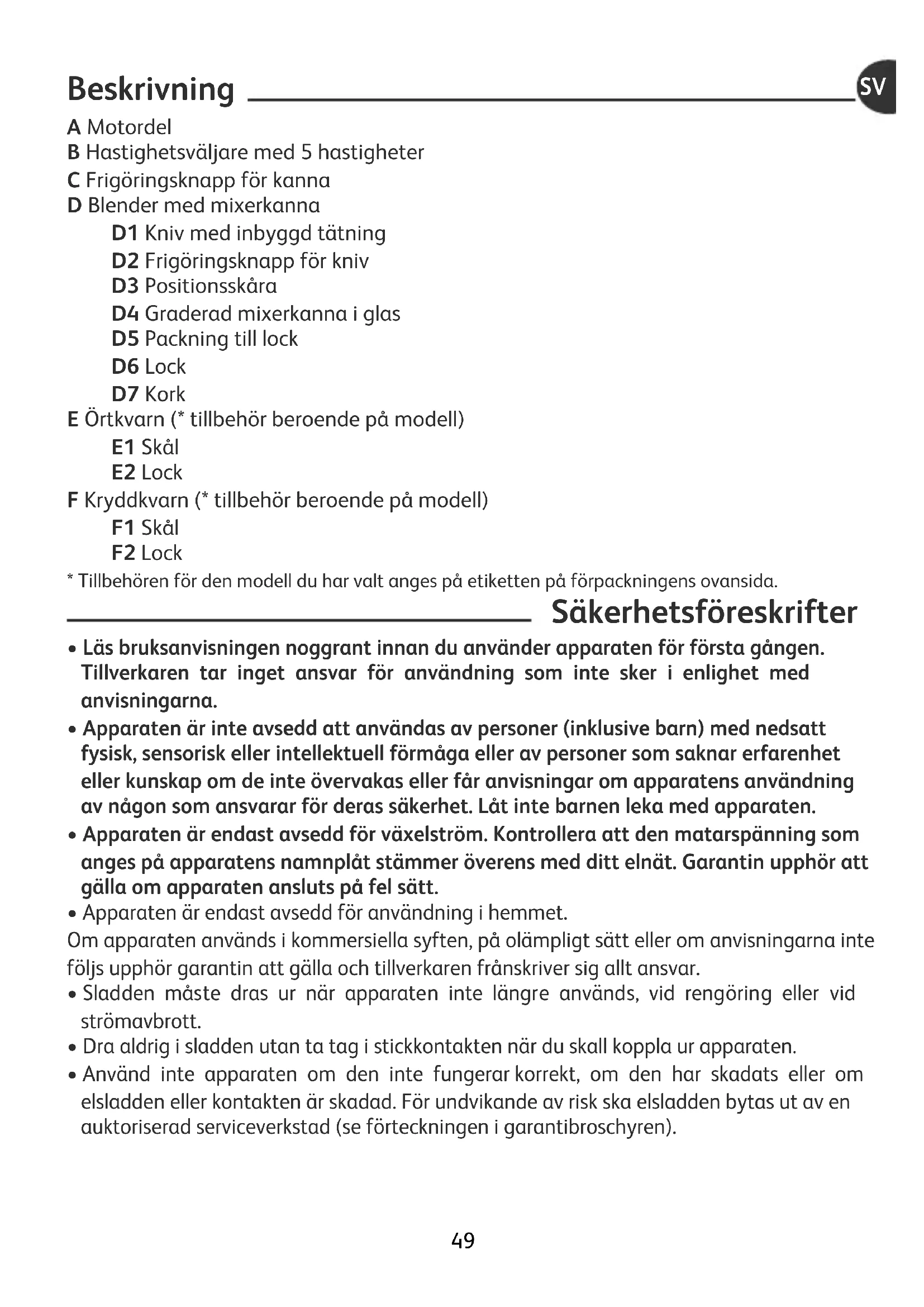 Beskrivning A Motordel B Hastighetsväljare med 5 hastigheter C Frigöringsknapp för kanna D Blender med mixerkanna D1 Kniv med inbyggd tätning D2 Frigöringsknapp för kniv D3 Positionsskåra D4 Graderad mixerkanna i glas D5 Packning till lock D6 Lock D7 Kork E Örtkvarn (* tillbehör beroende på modell) E1 Skål E2 Lock F Kryddkvarn (* tillbehör beroende på modell) F1 Skål F2 Lock