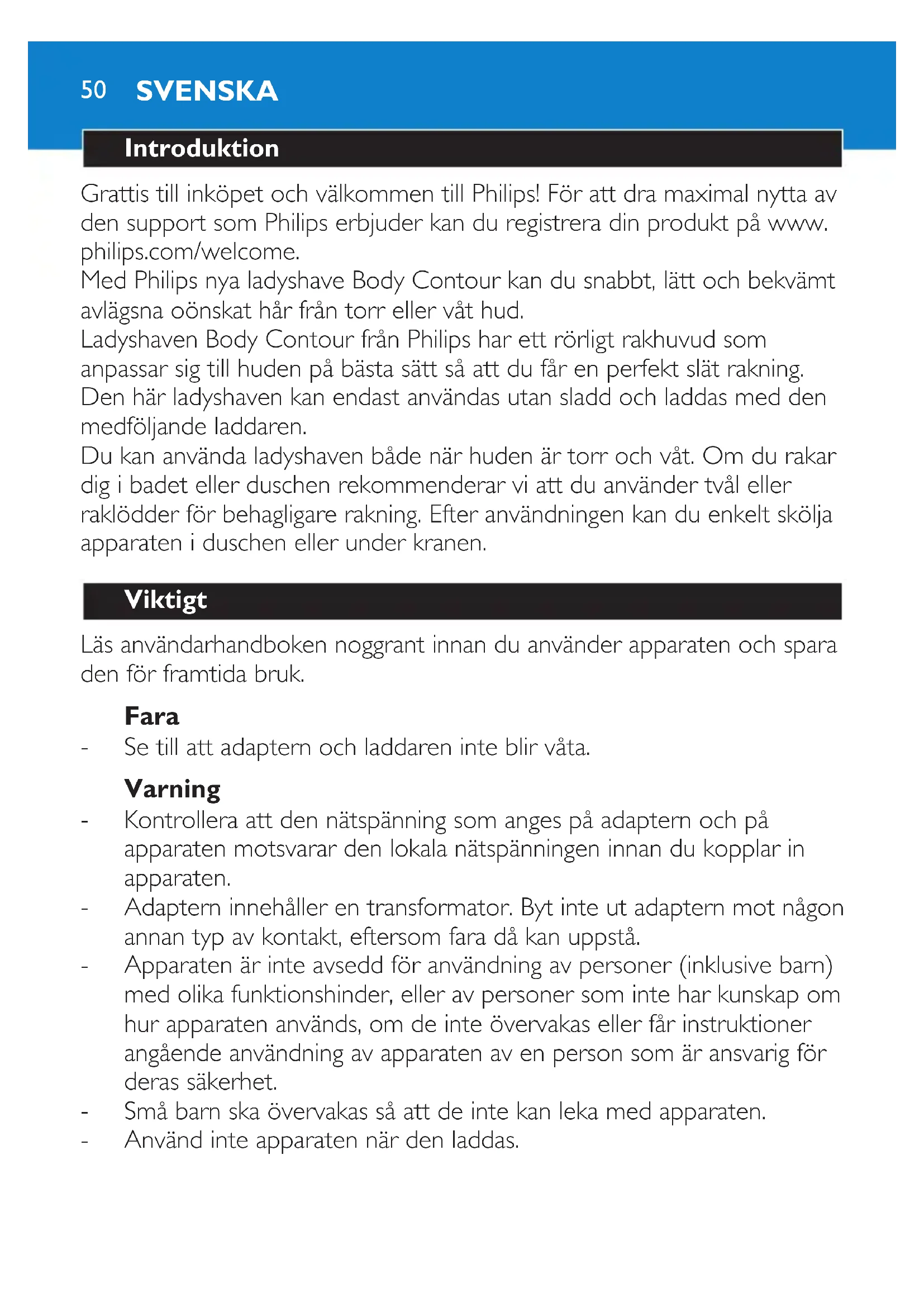 NORSK48Avhende batteriet 1 Ta ladyshaven ut av laderen. 2 La motoren gå til batteriet er helt tomt. 3 Trekk den øvre delen av ladyshaven løs fra nedre del. Du må bruke littkraft(g.22). 4 Fjernbatterietmedenskrutrekker(g.23). Garanti og service Hvis du trenger service eller informasjon, kan du gå til Philips’ Internett- sider på www.philips.com eller ta kontakt med Philips’ kundestøtte der du er (du nner telefonnummeret i garantiheftet). Hvis det ikke nnes noen Philips-kundestøtte der du bor, kan du ta kontakt med den lokale Philips-forhandleren eller serviceavdelingen ved Philips Domestic Appliances and Personal Care BV. NORSK 4950 Introduktion Grattis till inköpet och välkommen till Philips! För att dra maximal nytta av den support som Philips erbjuder kan du registrera din produkt på www. philips.com/welcome. Med Philips nya ladyshave Body Contour kan du snabbt, lätt och bekvämt avlägsna oönskat hår från torr eller våt hud. Ladyshaven Body Contour från Philips har ett rörligt rakhuvud som anpassar sig till huden på bästa sätt så att du får en perfekt slät rakning. Den här ladyshaven kan endast användas utan sladd och laddas med den medföljande laddaren. Du kan använda ladyshaven både när huden är torr och våt. Om du rakar dig i badet eller duschen rekommenderar vi att du använder tvål eller raklödder för behagligare rakning. Efter användningen kan du enkelt skölja apparaten i duschen eller under kranen. Viktigt Läs användarhandboken noggrant innan du använder apparaten och spara den för framtida bruk. Fara Se till att adaptern och laddaren inte blir våta. Varning Kontrollera att den nätspänning som anges på adaptern och på apparaten motsvarar den lokala nätspänningen innan du kopplar in apparaten. Adaptern innehåller en transformator. Byt inte ut adaptern mot någon annan typ av kontakt, eftersom fara då kan uppstå. Apparaten är inte avsedd för användning av personer (inklusive barn) med olika funktionshinder, eller av personer som inte har kunskap om hur apparaten används, om de inte övervakas eller får instruktioner angående användning av apparaten av en person som är ansvarig för deras säkerhet. Små barn ska övervakas så att de inte kan leka med apparaten. Använd inte apparaten när den laddas.