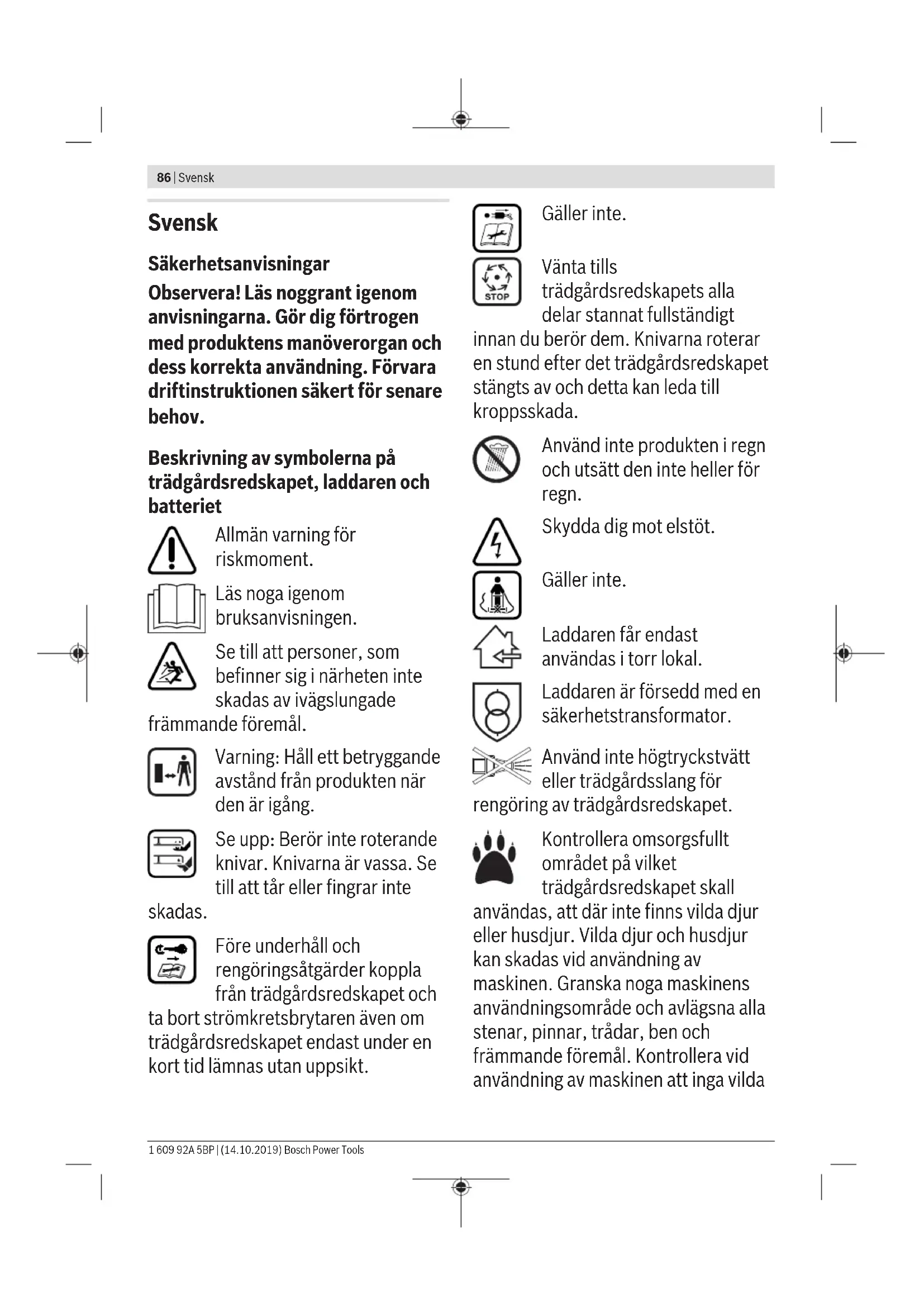 Løbetiden forlænges ved at købe en ekstra akku hos et auto- riseret servicecenter for Bosch haveredskab. Fejlsøgning Symptom Mulig årsag Afhjælpning Motoren går ikke i gang Haveredskabets indvendige ledninger er beskadi- get Kontakt Bosch kundeservicen Akkuen er afladt Oplad akkuen Akkuen er for kold/varm Opvarm/afkøl akkuen Græs for langt Maks. tilladt græshøjde er 30 cm med den største indstilling af slåhøjden Motorværn er aktiveret Lad motoren afkøle og indstil en større slåhøjde Strømkredsafbryderen er ikke blevet sat rigtigt i/ fuldstændigt i Sæt den rigtigt i Haveredskab kører i intervaller Haveredskabets indvendige ledninger er beskadi- get Kontakt Bosch kundeservicen Motorværn er aktiveret Lad motoren afkøle og indstil en større slåhøjde Haveredskabet efter- lader et uregelmæssigt slåbillede, og/eller motoren arbejder tungt Slåhøjden er for lav Indstil en større slåhøjde Knive er sløve Skift knive (se Fig. J) Tilstopning mulig Sluk haveredskabet og løsn strømkredsafbry- deren Kontrollér undersiden på haveredskabet og frigør det evt. for græs (brug altid havehandsker) Kniven er monteret forkert Montér kniven rigtigt Når haveredskabet tændes, drejer kniven ikke Kniven bremses af græsset Sluk haveredskabet og løsn strømkredsafbry- deren Fjern blokeringen (brug altid havehandsker) Knivmøtrikken/-skruen er løs Spænd knivmøtrikken/-skruen (27Nm) For stor vibration/støj Knivmøtrikken/-skruen er løs Spænd knivmøtrikken/-skruen (27Nm) 1 609 92A 5BP | (14.10.2019) Bosch Power ToolsDansk | 85 Symptom Mulig årsag Afhjælpning Knivene er beskadigede Skift knive (se Fig. J) Akku og ladeaggregat Symptomer Mulig årsag Afhjælpning Den røde akku-kontrol- lampe blinker på lade- aggregatet Opladning er ikke mulig Akkuen er ikke sat (rigtigt) i Anbring akkuen korrekt på ladeaggregatet Akkukontakter er snavset Rengør akkukontakterne; f.eks. ved at sætte ak- kuen i og tage den ud flere gange eller erstatte den Akku defekt Skift akkuen Akku-kontrollamper ly- ser ikke på ladeaggre- gatet Ladeaggregatets netstik er ikke sat (rigtigt) i Sæt netstikket (helt) ind i stikdåsen Stikdåse, netkabel eller ladeaggregat er defekt Kontrollér netspændingen, lad evt. ladeaggrega- tet blive kontrolleret af en autoriseret servicecen- ter for Bosch-el‑værktøj Vedligeholdelse og service Akku-pleje u Bemærk! Sluk for haveredskabet, løsn strømkredsaf- bryderen og fjern akkuen samt græsboksen, før vedli- geholdelses- eller rengøringsarbejde gennemføres. u Brug altid havehandsker, hvis du håndterer eller ar- bejder i nærheden af skarpe knive. Overhold følgende forskrifter og foranstaltninger for at mu- liggøre en optimal brug af akkuen: – Beskyt akkuen mod fugtighed og vand. – Opbevar kun haveredskabet og akkuen ved temperaturer mellem -20 °C og 50 °C. Lad f.eks. ikke akkuen blive lig- gende i bilen om sommeren. – Opbevar akkuen separat og ikke i haveredskabet. – Lad ikke akkuen blive siddende i haveredskabet i solskinsvejr. – Den optimale temperatur til opbevaring af akkuen er 5 °C. – Rengør akkuens ventilationsåbninger en gang imellem med en blød, ren og tør pensel. Når driftstiden efter opladningen forkortes væsentligt, er det tegn på, at akkuen er slidt op og skal udskiftes. Kundeservice og anvendelsesrådgivning www.bosch-garden.com Produktets 10‑cifrede varenummer (se typeskilt) skal altid angives ved forespørgsler og bestilling af reservedele. Dansk Bosch Service Center Telegrafvej 3 2750 Ballerup På www.bosch-pt.dk kan der online bestilles reservedele el- ler oprettes en reparations ordre. Tlf. Service Center: 44898855 Fax: 44898755 E-Mail: vaerktoej@dk.bosch.com Transport De indeholdte Li-Ion-akkuer overholder bestemmelserne om farligt gods. Akkuerne kan transporteres af brugeren på of- fentlig vej uden yderligere pålæg. Ved forsendelse gennem tredjemand (f.eks.: lufttransport el- ler spedition) skal særlige krav vedr. emballage og mærkning overholdes. Her skal man kontakte en faregodsekspert, før forsendelsesstykket forberedes. Send kun akkuer, hvis huset er ubeskadiget. Tilklæb åbne kontakter og indpak akkuen på en sådan måde, at den ikke kan bevæge sig i emballagen. Eventuelle mere vidtgående nationale forskrifter skal også overholdes. Bortskaffelse Haveredskaber, akku, tilbehør og emballage skal genbruges på en miljøvenlig måde. Smid ikke haveredskaber og ak- kuer/batterier ud sammen med det almindelige husholdningsaf- fald! Gælder kun i EU‑lande: Iht. det europæiske direktiv 2012/19/EU skal affald af elek- trisk og elektronisk udstyr (WEEE) og iht. det europæiske di- rektiv 2006/66/EF skal defekte eller opbrugte akkuer/batte- rier indsamles separat og genbruges iht. gældende miljøfor- skrifter. Akkuer/batterier: Li-Ion: Følg venligst henvisninger i afsnit Transport. Bosch Power Tools 1 609 92A 5BP | (14.10.2019)86 | Svensk Svensk Säkerhetsanvisningar Observera! Läs noggrant igenom anvisningarna. Gör dig förtrogen med produktens manöverorgan och dess korrekta användning. Förvara driftinstruktionen säkert för senare behov. Beskrivning av symbolerna på trädgårdsredskapet, laddaren och batteriet Allmän varning för riskmoment. Läs noga igenom bruksanvisningen. Se till att personer, som befinner sig i närheten inte skadas av ivägslungade främmande föremål. Varning: Håll ett betryggande avstånd från produkten när den är igång. Se upp: Berör inte roterande knivar. Knivarna är vassa. Se till att tår eller fingrar inte skadas. Före underhåll och rengöringsåtgärder koppla från trädgårdsredskapet och ta bort strömkretsbrytaren även om trädgårdsredskapet endast under en kort tid lämnas utan uppsikt. Gäller inte. Vänta tills trädgårdsredskapets alla delar stannat fullständigt innan du berör dem. Knivarna roterar en stund efter det trädgårdsredskapet stängts av och detta kan leda till kroppsskada. Använd inte produkten i regn och utsätt de
