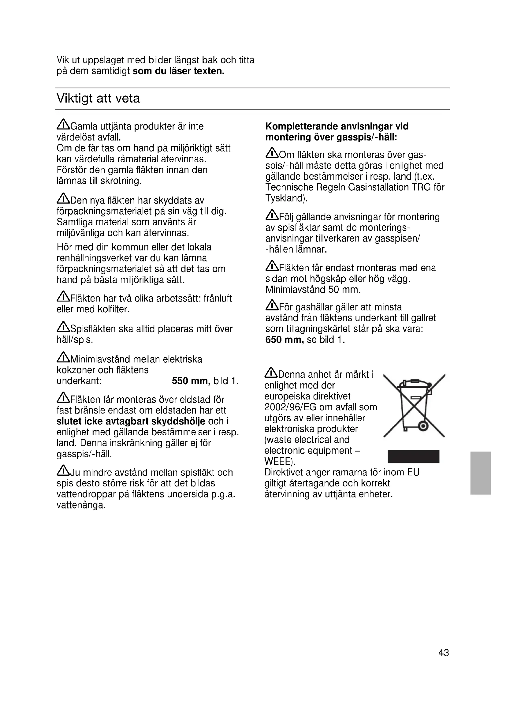 Το ηλεκτρονικ% σύστηµα ελέγχου έχει ρυθµιστεί στη λειτουργία απορρ%φησης ακάθαρτου αέρα. Αλλαγή ρύθµισης απ% τη λειτουργία απορρ%φησης ακάθαρτου αέρα στη λειτουργία ανακύκλωσης αέρα DIA096751: DIK106750:43 Viktigt att veta Kompletterande anvisningar vid montering över gasspis/-häll: Om fläkten ska monteras över gas- spis/-häll måste detta göras i enlighet med gällande bestämmelser i resp. land (t.ex. Technische Regeln Gasinstallation TRG för Tyskland). Följ gällande anvisningar för montering av spisfläktar samt de monterings- anvisningar tillverkaren av gasspisen/ -hällen lämnar. Fläkten får endast monteras med ena sidan mot högskåp eller hög vägg. Minimiavstånd 50 mm. För gashällar gäller att minsta avstånd från fläktens underkant till gallret som tillagningskärlet står på ska vara: 650 mm, se bild 1. Gamla uttjänta produkter är inte värdelöst avfall. Om de får tas om hand på miljöriktigt sätt kan värdefulla råmaterial återvinnas. Förstör den gamla fläkten innan den lämnas till skrotning. Den nya fläkten har skyddats av förpackningsmaterialet på sin väg till dig. Samtliga material som använts är miljövänliga och kan återvinnas. Hör med din kommun eller det lokala renhållningsverket var du kan lämna förpackningsmaterialet så att det tas om hand på bästa miljöriktiga sätt. Fläkten har två olika arbetssätt: frånluft eller med kolfilter. Spisfläkten ska alltid placeras mitt över häll/spis. Minimiavstånd mellan elektriska kokzoner och fläktens underkant: 550 mm, bild 1. Fläkten får monteras över eldstad för fast bränsle endast om eldstaden har ett slutet icke avtagbart skyddshölje och i enlighet med gällande bestämmelser i resp. land. Denna inskränkning gäller ej för gasspis/-häll. Ju mindre avstånd mellan spisfläkt och spis desto större risk för att det bildas vattendroppar på fläktens undersida p.g.a. vattenånga. Vik ut uppslaget med bilder längst bak och titta på dem samtidigt som du läser texten. Denna anhet är märkt i enlighet med der europeiska direktivet 2002/96/EG om avfall som utgörs av eller innehåller elektroniska produkter (waste electrical and electronic equipment – WEEE). Direktivet anger ramarna för inom EU giltigt återtagande och korrekt återvinning av uttjänta enheter.44 Före monteringen Frånluft bild 2 Den avgående luften leds via en ventilationstrumma uppåt eller direkt ut i det fria.