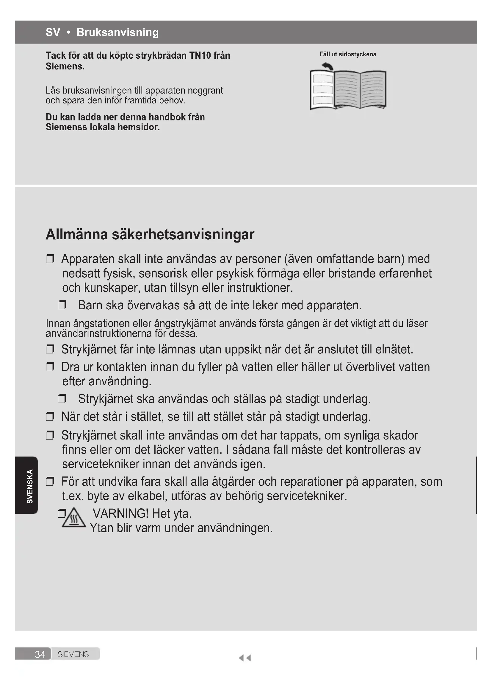 VARNING! Het yta. Ytan blir varm under användningen. SV • Bruksanvisning Tack för att du köpte strykbrädan TN10 från Siemens. Läs bruksanvisningen till apparaten noggrant och spara den inför framtida behov. Du kan ladda ner denna handbok från Siemenss lokala hemsidor.35 S I E M E N S SvENSka Viktiga anmärkningar
