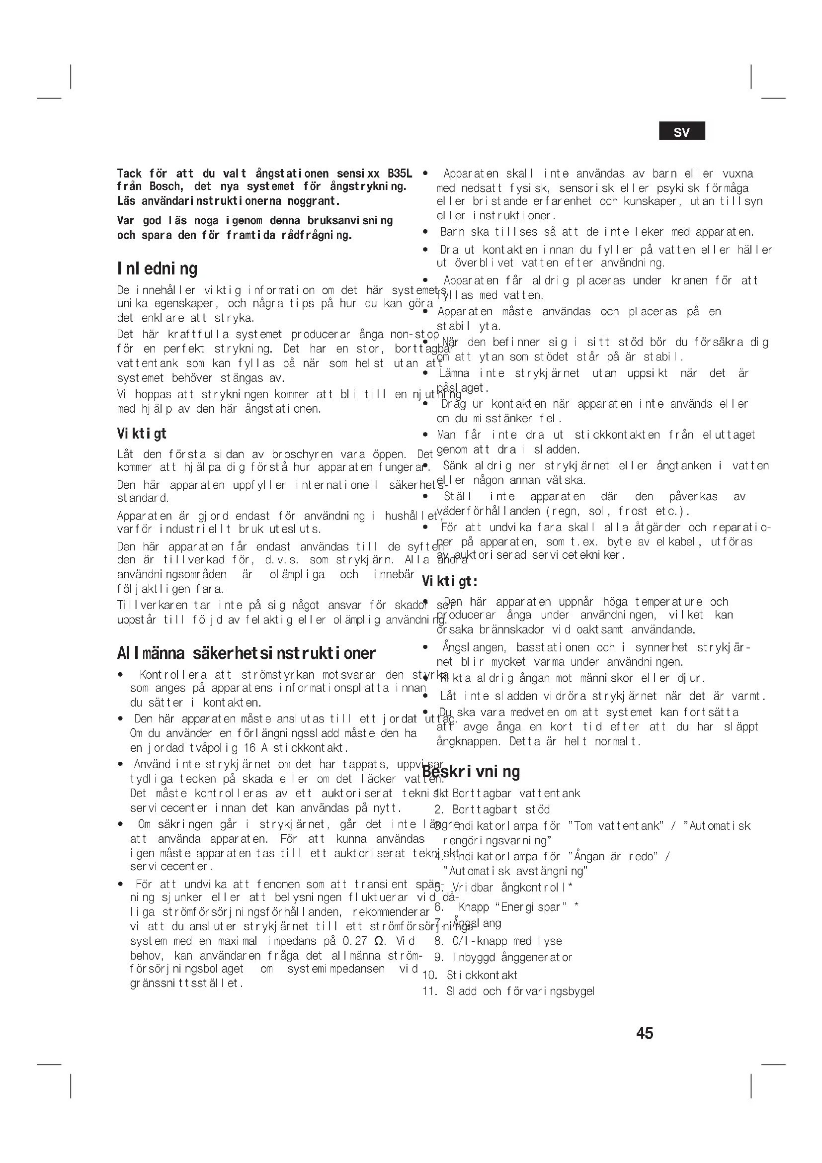 Skroting For aktuelle veiledninger angående skroting bør du ta kontakt med forhandleren eller med kommunen på stedet der du bor. Dette apparatet er klassifisert i hen- hold til det europeiske direktivet 2002/96/EF om avhen ding av elektrisk- og elektronisk utstyr (waste electrical and electro nic equipment – WEEE). Direktivet angir rammene for innlevering og gjenvinning av innbytteprodukter. Problem Mulige årsaker Løsning Det kommer røyk fra strykejernet når det slåes på. Ved førstegangsbruk: Noen av komponentene har blitt lett smurt på fabrikken og disse kan produsere noe røyk når strykejernet varmes opp for første gang. Ved senere bruk: Strykejernssålen kan være skitten. Dette er helt normalt og vil opphøre etter en liten stund. Rengjør sålen slik det forklares i denne bruksanvisningen under rengjøring og vedlikehold. Det drypper vann fra hullene i strykejernssålen. Dampfunksjonen brukes før strykejernet har nådd riktig temperatur. Vannkondens i slangene grunnet førstegangsbruk eller fordi det er lenge siden strykejernet har blitt brukt. Reduser dampstrømmen når du stryker ved lave temperaturer (termostaten for regulering av damp (5)). Rett strykejernet vekk fra stryketøyet og trykk på dampknappen (15) flere ganger, helt til det bare kommer ut damp. Det kommer skitt fra sålen på strykejernet eller den er flekkete. Det har dannet seg belegg eller mineraloppsamlinger i damptanken. Det har vært brukt kjemiske rengjøringsmidler eller stivelse. Bruk kranvann blandet med 50% destillert eller demineralisert vann. Hvis springvannet i ditt distrikt er veldig hardt, bland springvannet med destillert vann i forholdet 1:2. Tørk av sålen med en fuktig klut. Du må ikke tilsette stoffer i vannkokeren. Det kommer ingen damp fra strykejernet. Vannkokeren er ikke slått på eller vanntanken er tom. Vanntanken er ikke plassert riktig på damptanken. Damp termostaten står på minimum. Slå på “0/I” bryteren for varmetanken og hovedstrømmen (8) så den står på “I” og/eller fyll vanntanken. Plasser vanntanken riktig på damptanken (til du hører et klikk). Øk dampstrømmen ved å vri på termostaten for regulering av damp (5). Plagget som strykes blir mørkt og/eller strykeflaten blir kleberlig. Den valgte temperaturen er for høy og har ødelagt plagget. Velg en passende temperatur for det materialet og rengjør strykeflaten med en fuktig klut. Strykeflaten blir brun. Dette er en normal konsekvens ved bruk. Rengjør jevnlig strykeflaten med en fuktig klut. Strykejernet slutter ikke å slippe ut damp etter at det er satt på underlaget. “Intelligent damp”funksjonen aktivert. Trykk på utløseren én gang til, og strykejernet slutter å slippe ut damp umiddelbart. Apparatet lager en pumpelyd. Vann pumpes inn i dampgeneratoren. Lyden stopper ikke. Det er helt normalt. Dersom ikke lyden opphører, må dampgene- ratoren ikke brukes. Ta kontakt med et autorisert servicesenter for å sjekke ut feilen. Tap av damptrykk under stryking Dampknappen holdes nede over lengre tid. Trykk på dampknappen (15) gjentatte ganger. Dette vil føre til et bedre strykeresultat ved at tøyet tørker bedre og holder seg mykere Det lekker vann fra varmtvannsbeholderen Tappepluggen i bunnen av apparatet er løs. Stram til tappepluggen med en mynt. Dersom ikke noe av dette som er nevnt ovenforskulle løse problemet, ta kontakt med et autorisertteknisk servicesenter. Du kan laste ned denne bruksanvisningen fra Bosch sine lokale nettsider.45 Tack för att du valt ångstationen sensixx B35L från Bosch, det nya systemet för ångstrykning. Läs användarinstruktionerna noggrant. Var god läs noga igenom denna bruksanvisning och spara den för framtida rådfrågning. Inledning De innehåller viktig information om det här systemets unika egenskaper, och några tips på hur du kan göra det enklare att stryka. Det här kraftfulla systemet producerar ånga non-stop för en perfekt strykning. Det har en stor, borttagbar vattentank som kan fyllas på när som helst utan att systemet behöver stängas av. Vi hoppas att strykningen kommer att bli till en njutning med hjälp av den här ångstationen. Viktigt Låt den första sidan av broschyren vara öppen. Det kommer att hjälpa dig förstå hur apparaten fungerar. Den här apparaten uppfyller internationell säkerhets- standard. Apparaten är gjord endast för användning i hushållet, varför industriellt bruk utesluts. Den här apparaten får endast användas till de syften den är tillverkad för, d.v.s. som strykjärn. Alla andra användningsområden är olämpliga och innebär följaktligen fara. Tillverkaren tar inte på sig något ansvar för skador som uppstår till följd av felaktig eller olämplig användning. Allmänna säkerhetsinstruktioner Kontrollera att strömstyrkan motsvarar den styrka som anges på apparatens informationsplatta innan du sätter i kontakten. Den här apparaten måste anslutas till ett jordat uttag. Om du använder en förlängningssladd måste den ha en jordad tvåpolig 16 A stickkontakt. Använd inte strykjärnet om det har tappats, uppvisar tydliga tecken på skada eller om det läcker vatten. Det måste kontrolleras av ett auktoriserat tekniskt servicecenter innan det kan användas på nytt. Om säkringen går i strykjärnet, går det inte längre att använda apparaten. För att kunna användas igen måste apparaten tas till ett auktoriserat tekniskt servicecenter. För att undvika att fenomen som att transient spän- ning sjunker eller att belysningen fluktuerar vid då- liga strömförsörjningsförhållanden, rekommenderar vi att du ansluter strykjärnet till ett strömförsörjnings- system med en maximal impedans på 0.27 Ω. Vid behov, kan användaren fråga det allmänna ström- försörjningsbolaget om systemimpedansen vid gränssnittsstället. Apparaten skall inte användas av barn eller vuxna med nedsatt fysisk, sensorisk eller psykisk förmåga eller bristande erfarenhet och kunskaper, ut