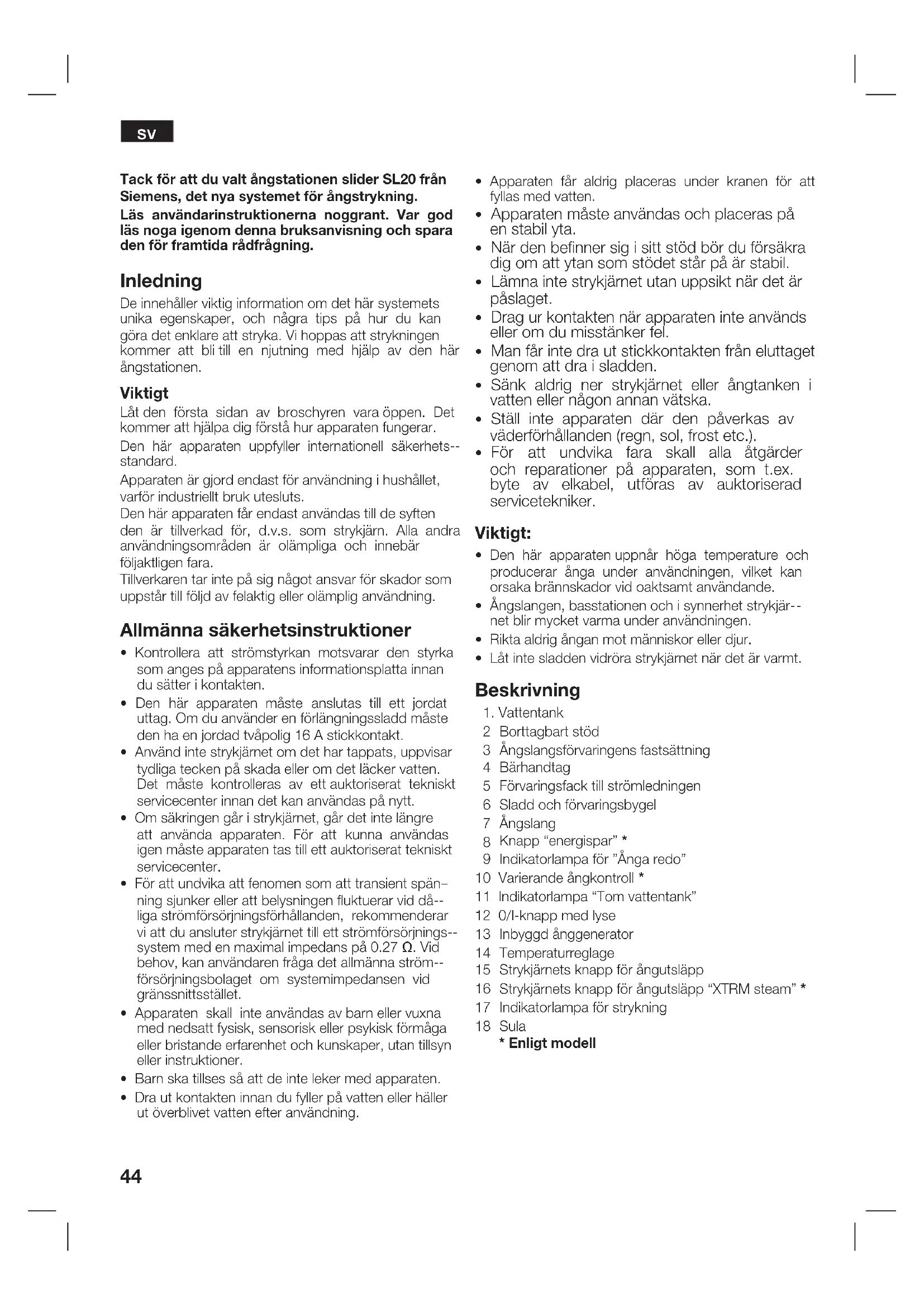 Tack för att du valt ångstationen slider SL20 från Siemens, det nya systemet för ångstrykning. Läs användarinstruktionerna noggrant. Var god läs noga igenom denna bruksanvisning och spara den för framtida rådfrågning. Inledning De innehåller viktig information om det här systemets unika egenskaper, och några tips på hur du kan göra det enklare att stryka. Vi hoppas att strykningen kommer att bli till en njutning med hjälp av den här ångstationen. Viktigt Låt den första sidan av broschyren vara öppen. Det kommer att hjälpa dig förstå hur apparaten fungerar. Den här apparaten uppfyller internationell säkerhets-- standard. Apparaten är gjord endast för användning i hushållet, varför industriellt bruk utesluts. Den här apparaten får endast användas till de syften den är tillverkad för, d.v.s. som strykjärn. Alla andra användningsområden är olämpliga och innebär följaktligen fara. Tillverkaren tar inte på sig något ansvar för skador som uppstår till följd av felaktig eller olämplig användning. Allmänna säkerhetsinstruktioner