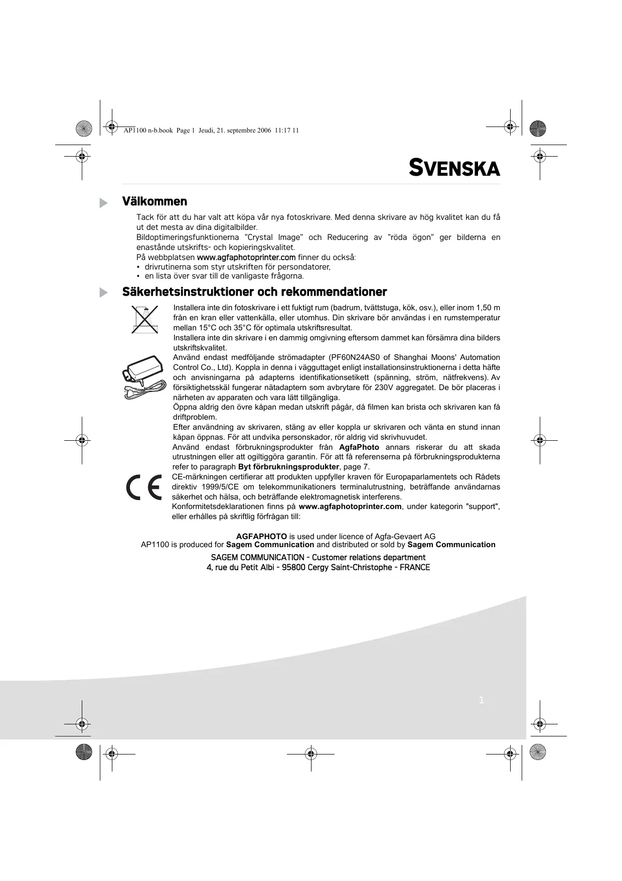 Ne pas installer votre imprimante photo ni dans une pièce humide (salle d'eau, salle de bain, buanderie, cuisine, etc..) à moins de 1,50 m d'un point d'eau ni en extérieur. Votre imprimante doit être utilisée à une température ambiante comprise entre 15 °C et 35 °C pour un rendu d’impression optimal. Ne pas installer votre imprimante dans un endroit poussiéreux, ces poussières pourraient dégrader la qualité d’impression de vos photos. Utilisez exclusivement le bloc secteur fourni (PF60N24AS0 of Shanghai Moons' Automation Control Co., Ltd), raccordez celui-ci sur le secteur conformément aux instructions d'installation de ce livret et aux indications portées sur l'étiquette d'identification apposée sur celui-ci (tension, courant, fréquence du réseau électrique). Par précaution, en cas de danger, les adaptateurs secteur servent de dispositif de sectionnement de l'alimentation 230 V. Ils doivent être situés à proximité de l'appareil et être aisément accessibles. Ne jamais ouvrir le capot supérieur en cours d'impression, vous risquez la rupture du film et par la suite un dysfonctionnement de votre imprimante. Après l’utilisation de l’imprimante, attendez quelques instants après la mise hors tension de l’imprimante avant de l’ouvrir. Pour éviter toute blessure, ne touchez en aucun cas la tête d’impression. Utilisez seulement les consommables de marque AgfaPhoto et exclusivement ceux-ci sinon vous risquez d'endommager l'appareil et de perdre la garantie. Pour connaître les références des consommables reportez-vous au paragraphe Consommables, page 7. Le marquage CE atteste de la conformité du produit aux exigences essentielles de la directive 1999/5/CE du Parlement et du Conseil Européen concernant les équipements terminaux de télécommunication, pour la sécurité et la santé des usagers, pour les perturbations électromagnétiques. La déclaration de conformité peut être consultée sur le site www.agfaphotoprinter.com ou peut être demandée à l'adresse suivante: AGFAPHOTO is used under licence of Agfa-Gevaert AG AP1100 is produced for Sagem Communication and distributed or sold by Sagem Communication SAGEM COMMUNICATION - Customer relations department Pour faciliter ce recyclage, veuillez respecter les règles de tri mises en place localement pour ce type de déchets. LES PILES ET BATTERIES Si votre produit contient des piles ou des batteries, ces dernières doivent être déposées dans les points de collecte désignés. LE PRODUIT La poubelle barrée apposée sur le produit ou ses accessoires signifie qu'ils appartiennent à la famille des équipements électriques et électroniques. A ce titre, la réglementation européenne vous demande de procéder à sa collecte sélective : - dans les points de distribution en cas d'achat d'un équipement équivalent, - dans les points de collecte mis à votre disposition localement (déchetterie, collecte sélective, etc.). Ainsi, vous participez à la réutilisation et à la valorisation des Déchets d'Equipement Electriques et Electroniques qui peuvent avoir des effets potentiels sur l'environnement et la santé humaine.