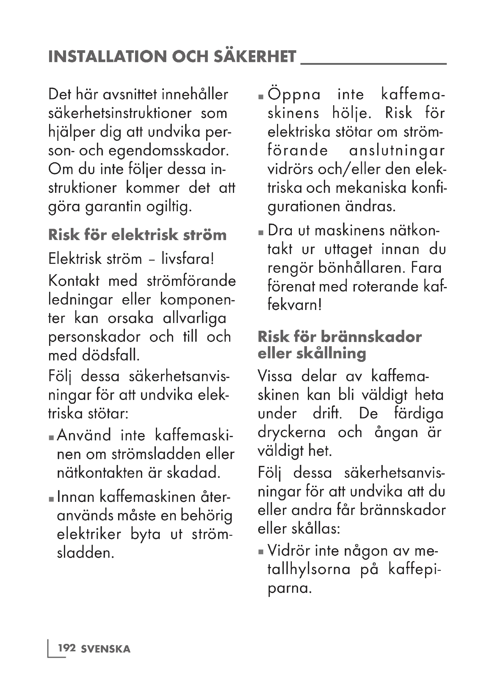 Dra ut maskinens nätkon- takt ur uttaget innan du rengör bönhållaren. Fara förenat med roterande kaf- fekvarn! Risk för brännskador eller skållning Vissa delar av kaffema- skinen kan bli väldigt heta under drift. De färdiga dryckerna och ångan är väldigt het. Följ dessa säkerhetsanvis- ningar för att undvika att du eller andra får brännskador eller skållas: