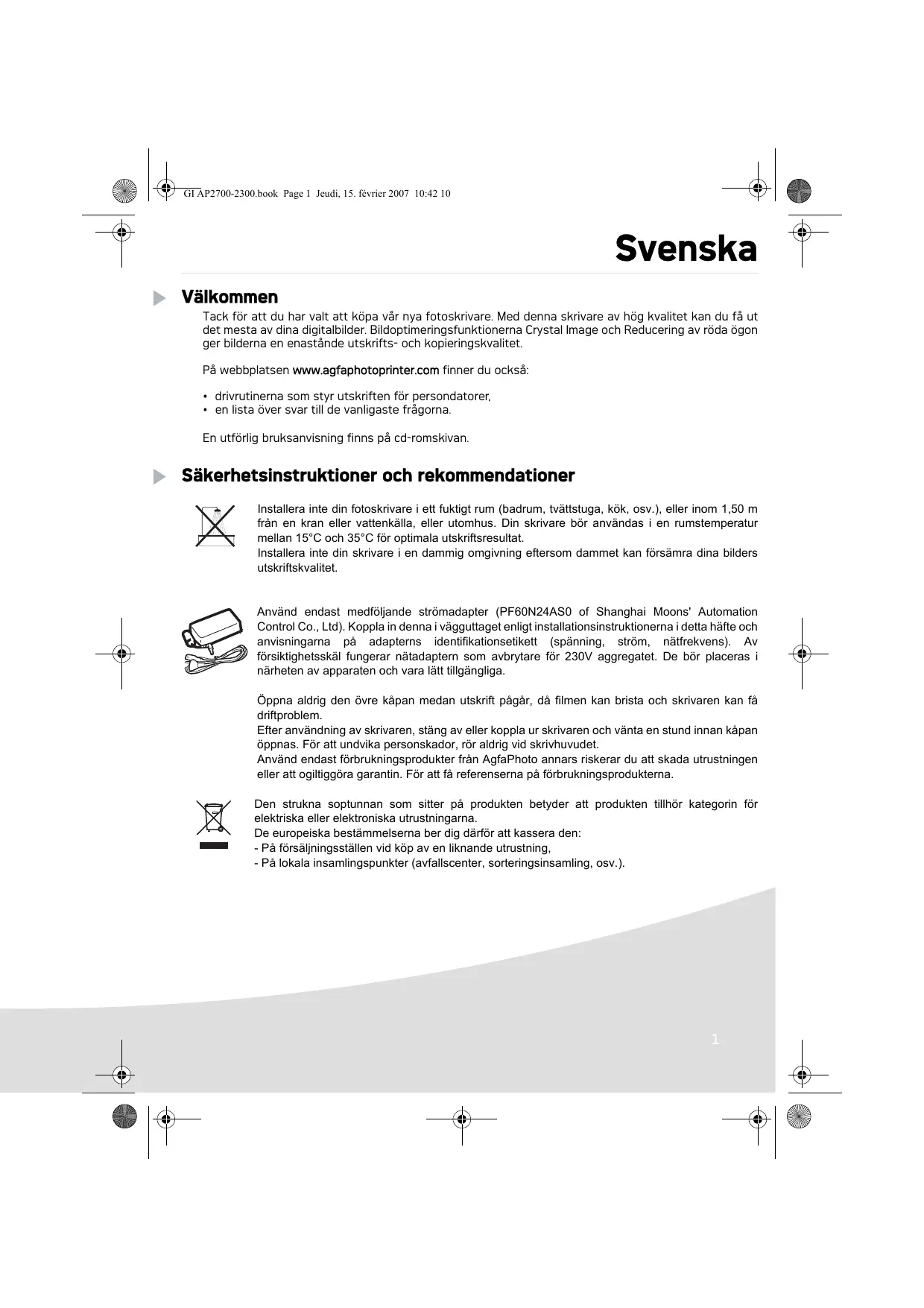 Ne pas installer votre imprimante photo ni dans une pièce humide (salle d'eau, salle de bain, buanderie, cuisine, etc..) à moins de 1,50 m d'un point d'eau ni en extérieur. Votre imprimante doit être utilisée à une température ambiante comprise entre 15 °C et 35 °C pour un rendu d’impression optimal. Ne pas installer votre imprimante dans un endroit poussiéreux, ces poussières pourraient dégrader la qualité d’impression de vos photos. Utilisez exclusivement le bloc secteur fourni (PF60N24AS0 of Shanghai Moons' Automation Control Co., Ltd), raccordez celui-ci sur le secteur conformément aux instructions d'installation de ce livret et aux indications portées sur l'étiquette d'identification apposée sur celui-ci (tension, courant, fréquence du réseau électrique). Par précaution, en cas de danger, les adaptateurs secteur servent de dispositif de sectionnement de l'alimentation 230 V. Ils doivent être situés à proximité de l'appareil et être aisément accessibles. Ne jamais ouvrir le capot supérieur en cours d'impression, vous risquez la rupture du film et par la suite un dysfonctionnement de votre imprimantAprès l’utilisation de l’imprimante, attendez quelques instants après la mise hors tension de l’imprimante avant de l’ouvrir. Pour éviter toute blessure, ne touchez en aucun cas la tête d’impression. Utilisez seulement les consommables de marque AgfaPhoto et exclusivement ceux-ci sinon vous risquez d'endommager l'appareil et de perdre la garantie. La poubelle barrée apposée sur le produit ou ses accessoires signifie qu'ils appartiennent à la famille des équipements électriques et électroniques. A ce titre, la réglementation européenne vous demande de procéder à sa collecte sélective : - dans les points de distribution en cas d'achat d'un équipement équivalent,