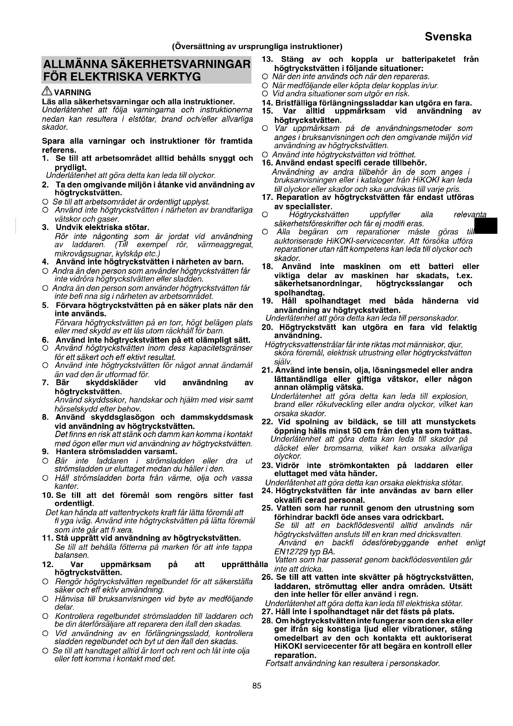 av specialister. ○ Högtryckstvätten uppfyller alla relevanta säkerhetsföreskrifter och får ej modifi eras. ○ Alla begäran om reparationer måste göras till auktoriserade HiKOKI-servicecenter. Att försöka utföra reparationer utan rätt kompetens kan leda till olyckor och skador.