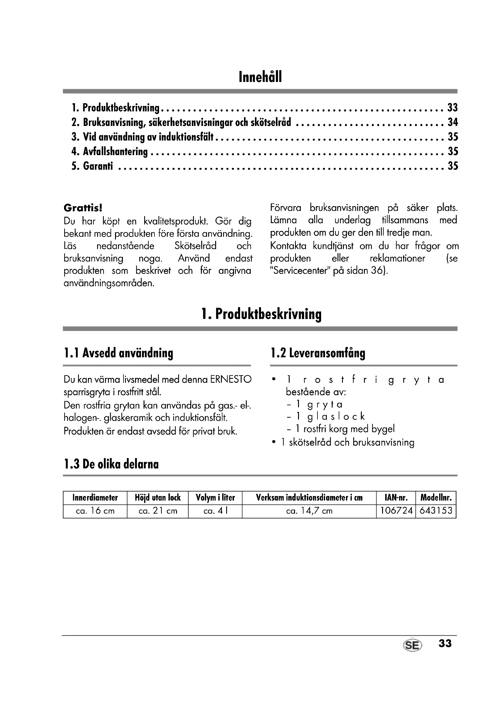 3. Vid användning av induktionsfält . . . . . . . . . . . . . . . . . . . . . . . . . . . . . . . . . . . . . . . . . . . 35 4. Avfallshantering . . . . . . . . . . . . . . . . . . . . . . . . . . . . . . . . . . . . . . . . . . . . . . . . . . . . . . . 35 5. Garanti . . . . . . . . . . . . . . . . . . . . . . . . . . . . . . . . . . . . . . . . . . . . . . . . . . . . . . . . . . . . . 35 Grattis! Du har köpt en kvalitetsprodukt. Gör dig bekant med produkten före första användning. Läs nedanstående Skötselråd och bruksanvisning noga. Använd endast produkten som beskrivet och för angivna användningsområden. Förvara bruksanvisningen på säker plats. Lämna alla underlag tillsammans med produkten om du ger den till tredje man. Kontakta kundtjänst om du har frågor om produkten eller reklamationer (se "Servicecenter" på sidan36).