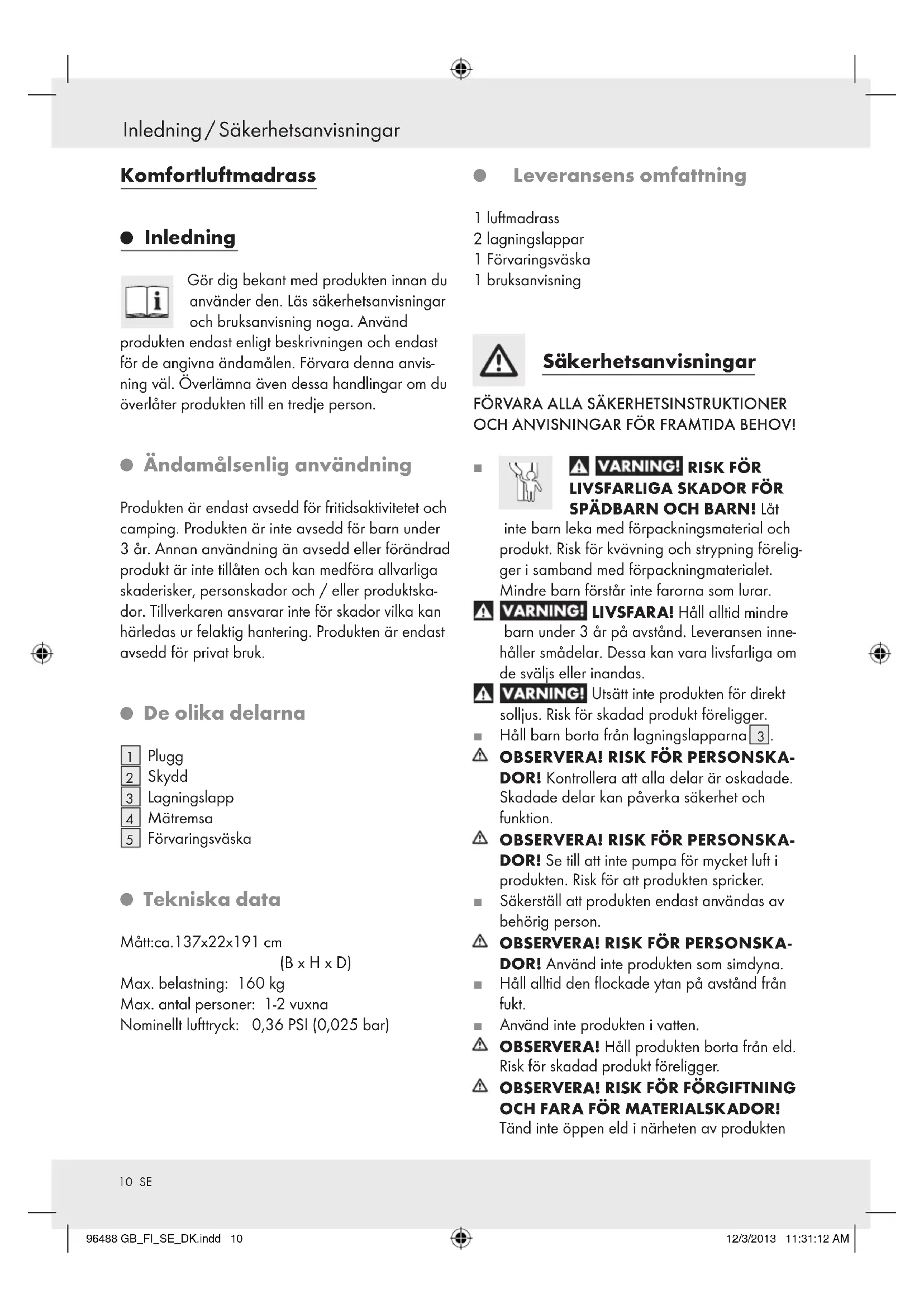 Avfallshantering Förpackningen består av miljövänligt material som kan avfallshanteras vid lokala återvinningsställen. Kontakta miljökontoret på din ort för vidare infor- mation om avfallshantering av förbrukad produkt. 96488 GB_FI_SE_DK.indd 12 12/3/2013 11:31:12 AM13 DK Indledning / Sikkerhedsanvisninger Komfort luftmadras