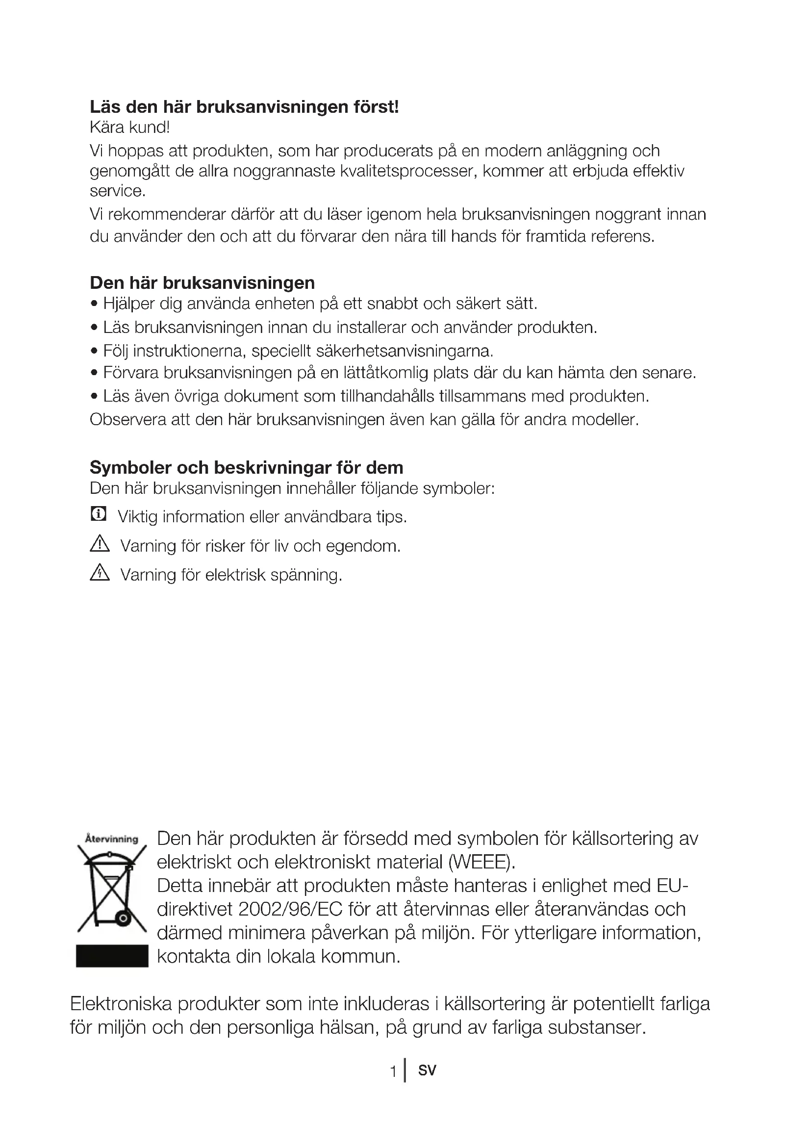 - Läs även övriga dokument som tillhandahålls tillsammans med produkten. Observera att den här bruksanvisningen även kan gälla för andra modeller. Symboler och beskrivningar för dem Den här bruksanvisningen innehåller följande symboler: C Viktig information eller användbara tips. A Varning för risker för liv och egendom. B Varning för elektrisk spänning. Den här produkten är försedd med symbolen för källsortering av elektriskt och elektroniskt material (WEEE). Detta innebär att produkten måste hanteras i enlighet med EU- direktivet 2002/96/EC för att återvinnas eller återanvändas och därmed minimera påverkan på miljön. För ytterligare information, kontakta din lokala kommun. Elektroniska produkter som inte inkluderas i källsortering är potentiellt farliga för miljön och den personliga hälsan, på grund av farliga substanser.2