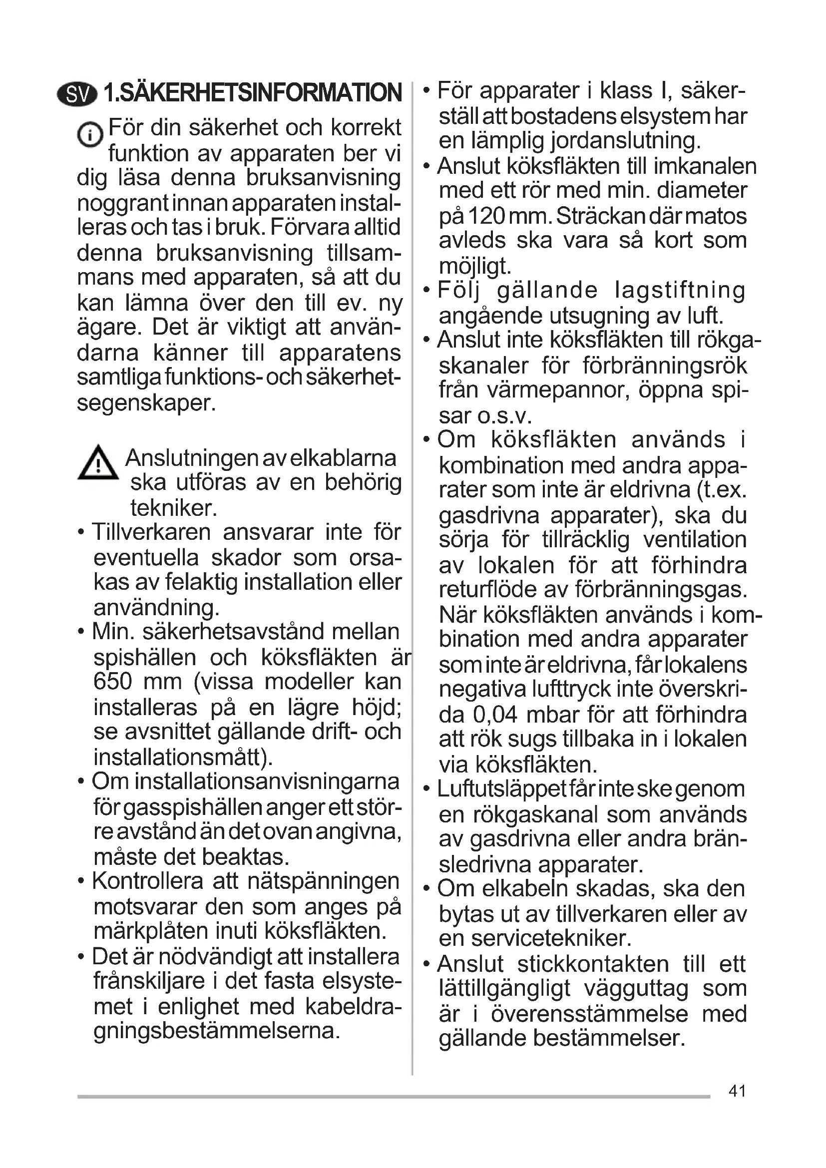 - Neem voor de vervanging contact op met de klantenservice (‘Wend u voor de aankoop tot de klantenservice’).41 1.SÄKERHETSINFORMATION För din säkerhet och korrekt funktion av apparaten ber vi dig läsa denna bruksanvisning noggrant innan apparaten instal- leras och tas i bruk. Förvara alltid denna bruksanvisning tillsam- mans med apparaten, så att du kan lämna över den till ev. ny ägare. Det är viktigt att använ- darna känner till apparatens samtliga funktions- och säkerhet- segenskaper. Anslutningen av elkablarna ska utföras av en behörig tekniker.