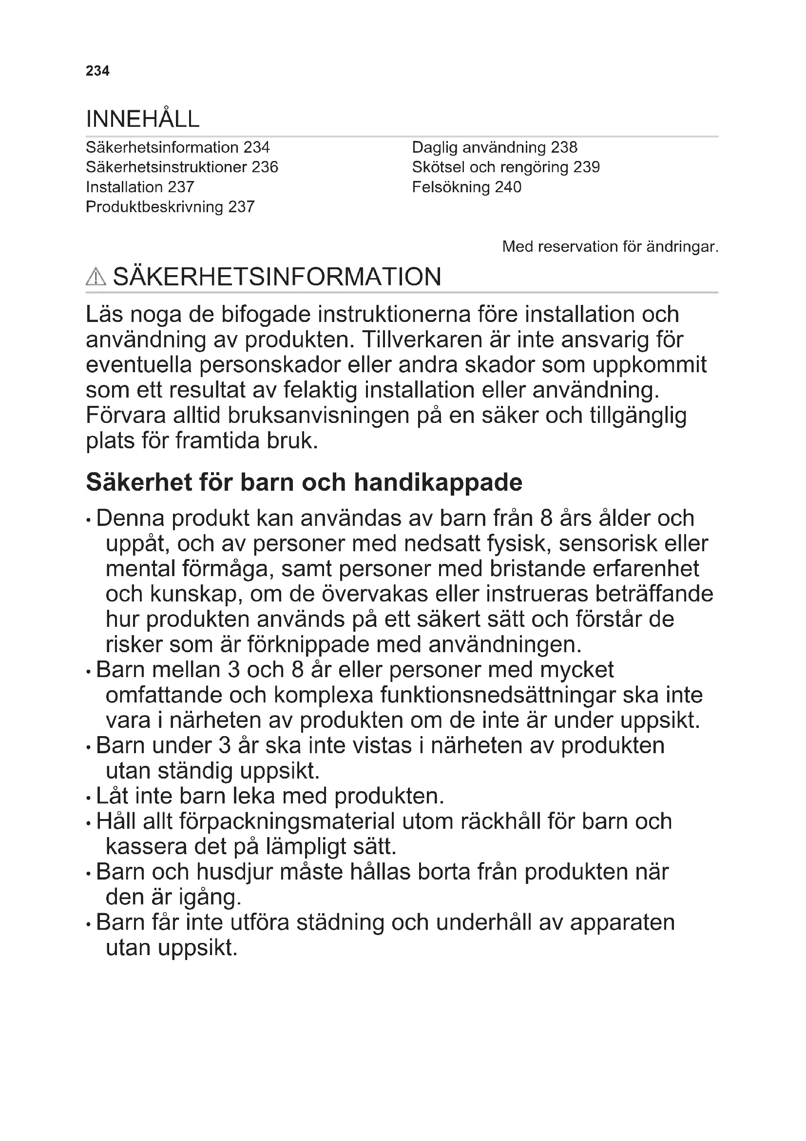 - Barn får inte utföra städning och underhåll av apparaten utan uppsikt. 234Allmän säkerhet