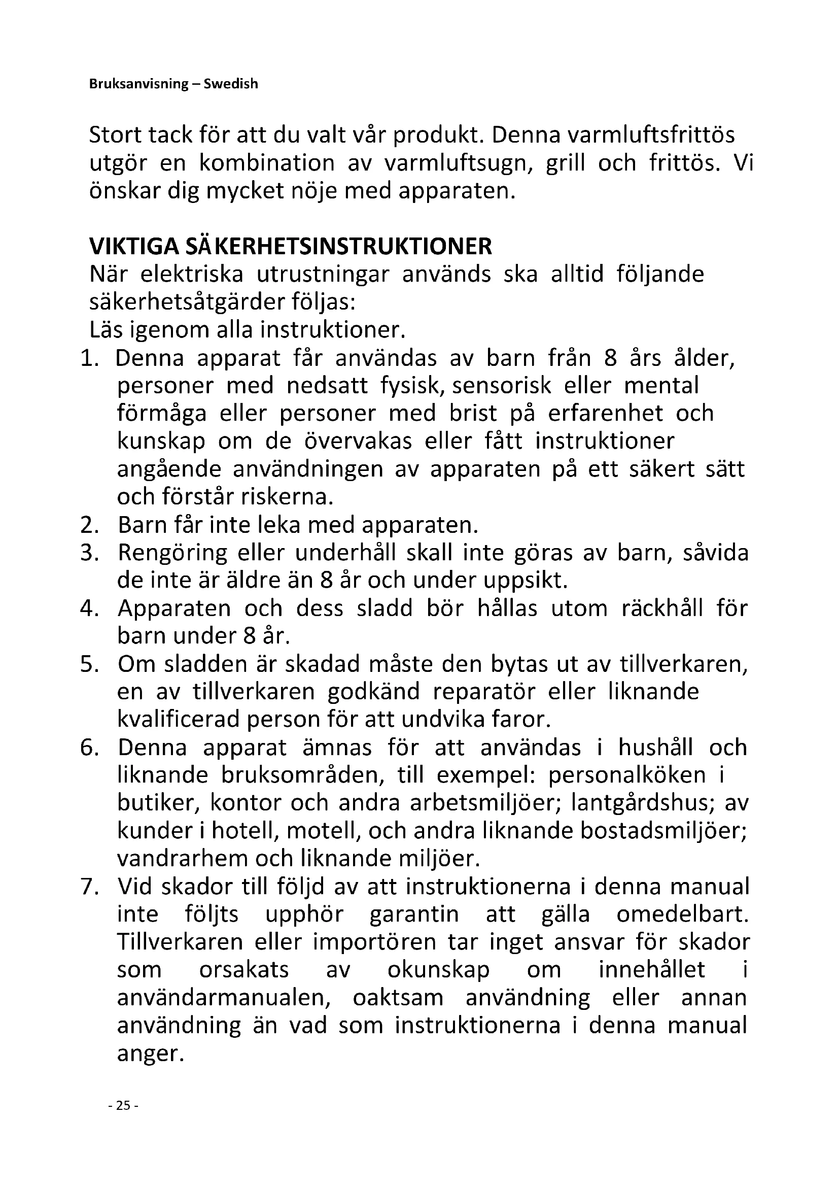 7. Vid skador till följd av att instruktionerna i denna manual