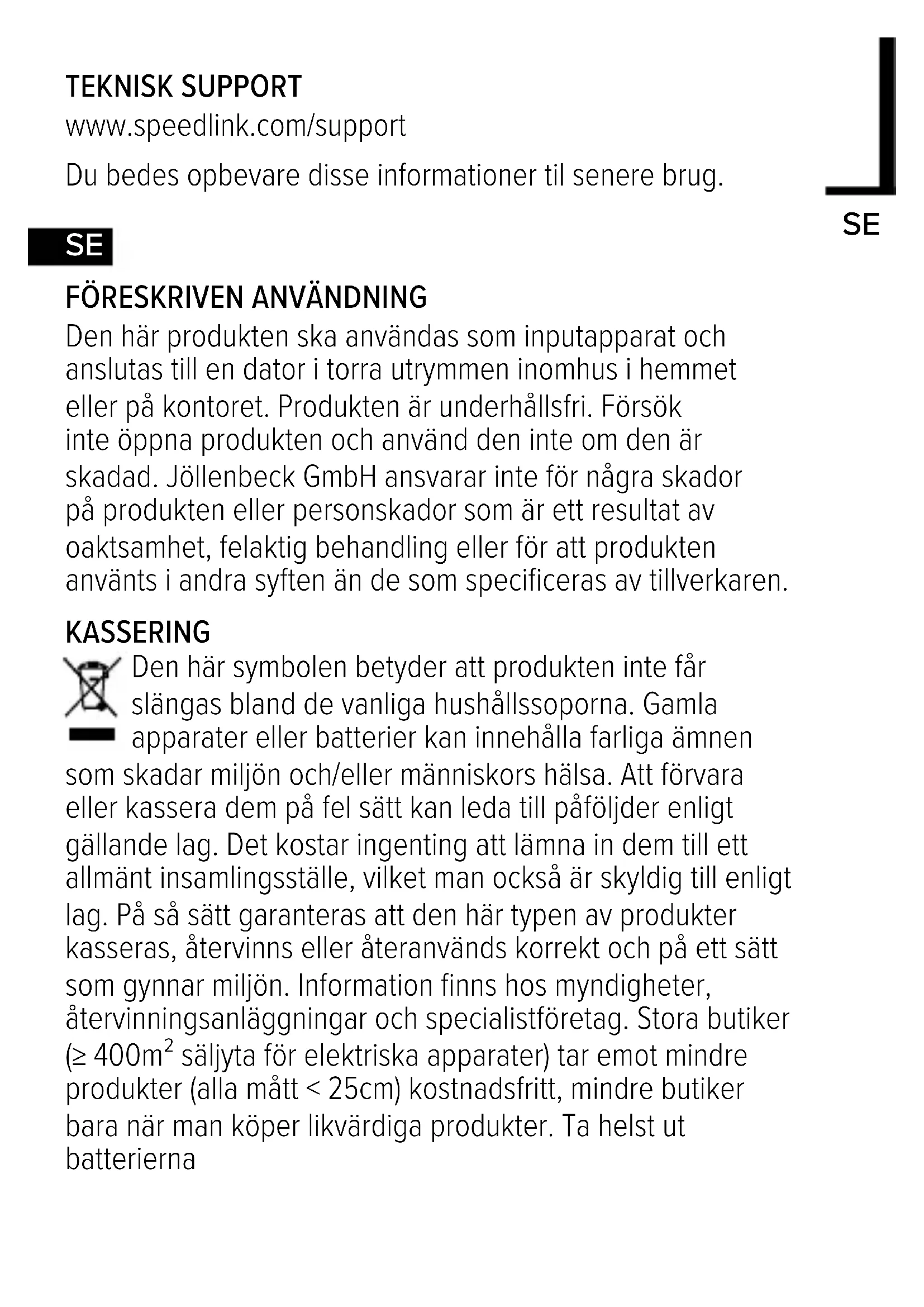 Den här produkten ska användas som inputapparat och anslutas till en dator i torra utrymmen inomhus i hemmet eller på kontoret. Produkten är underhållsfri. Försök inte öppna produkten och använd den inte om den är skadad. Jöllenbeck GmbH ansvarar inte för några skador på produkten eller personskador som är ett resultat av oaktsamhet, felaktig behandling eller för att produkten använts i andra syften än de som specificeras av tillverkaren. KASSERING Den här symbolen betyder att produkten inte får slängas bland de vanliga hushållssoporna. Gamla apparater eller batterier kan innehålla farliga ämnen som skadar miljön och/eller människors hälsa. Att förvara eller kassera dem på fel sätt kan leda till påföljder enligt gällande lag. Det kostar ingenting att lämna in dem till ett allmänt insamlingsställe, vilket man också är skyldig till enligt lag. På så sätt garanteras att den här typen av produkter kasseras, återvinns eller återanvänds korrekt och på ett sätt som gynnar miljön. Information finns hos myndigheter, återvinningsanläggningar och specialistföretag. Stora butiker (≥ 400m² säljyta för elektriska apparater) tar emot mindre produkter (alla mått < 25cm) kostnadsfritt, mindre butiker bara när man köper likvärdiga produkter. Ta helst ut batteriernaINFORMATION OM BATTERIER Den här produkten drivs med alkaliska manganceller. Endast den typen av batterier får användas. Byt genast ut gamla/urladdade batterier, ladda inte upp dem igen. Förvara batterier på ett torrt ställe utom räckhåll för barn. Får inte kastas i en eld eller utsättas för höga temperaturer.