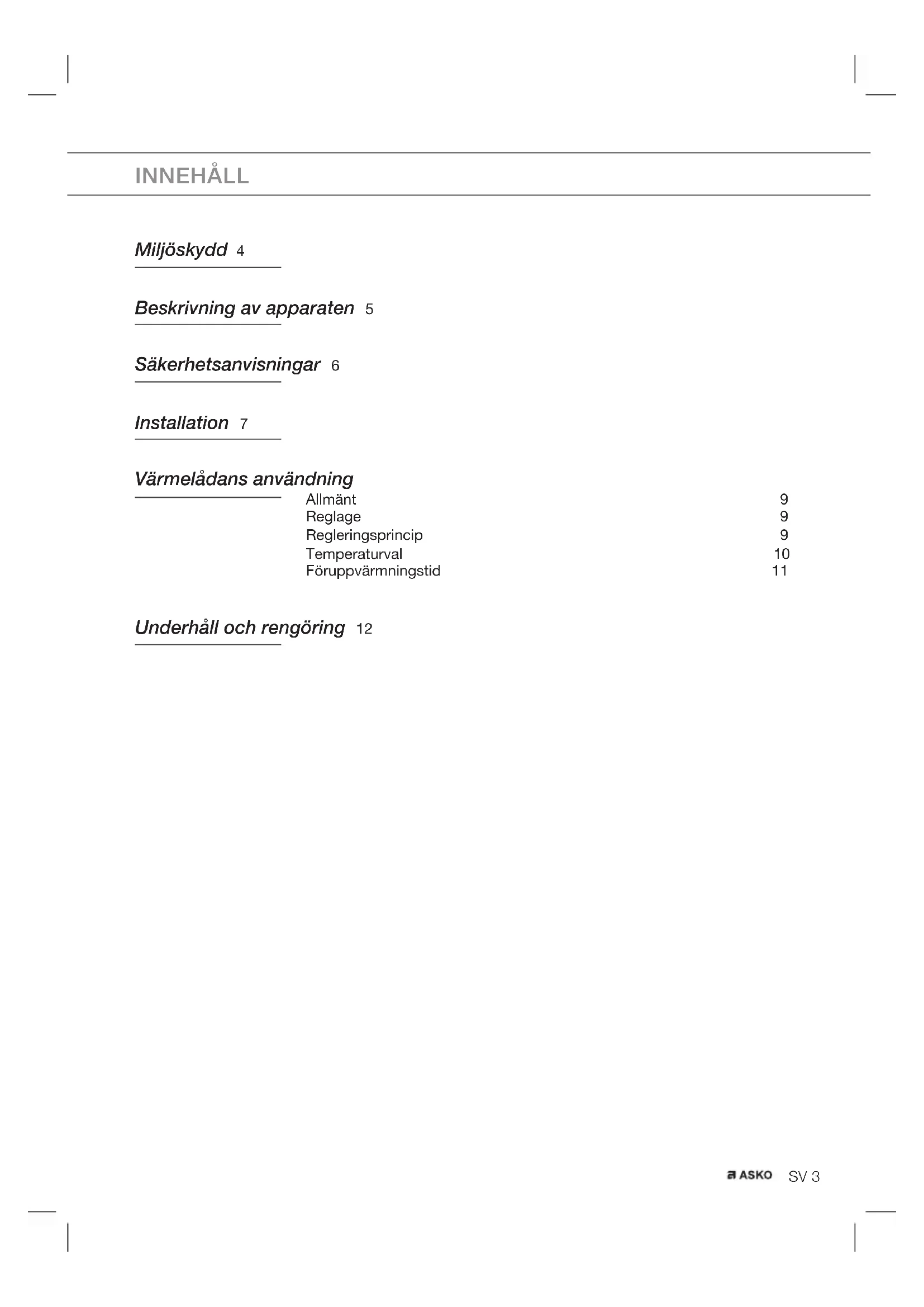 Før apparatet skal vedlikeholdes må det slås av og avkjøles. Rengjør alle overflater med en fuktig klut og såpevann. Tørk deretter av med en fuktig klut. Apparatet må ikke rengjøres med en dampvasker. Bruk av skurende produkter, alkohol eller løsemidler frarådes, de vil kunne skade apparatet. Forsiden er av rustfritt stål og kan lett få riper. Bruk derfor et spesialrengjøringsmiddel for rustfritt stål som ikke lager riper. Du kan rengjøre glassbunnen med varmt vann og oppvaskmiddel. Tørk deretter godt av den og sett den på plass i skuffen igjen når den er helt tørr.SV 3 INNEHÅLL Miljöskydd 4 Beskrivning av apparaten 5 Säkerhetsanvisningar 6 Installation 7 Värmelådans användning Allmänt 9 Reglage 9 Regleringsprincip 9 Temperaturval 10 Föruppvärmningstid 11 Underhåll och rengöring 12SV 4 MILJÖSKYDD Apparatens förpackningsmaterial kan återvinnas. Du bidrar till att skydda miljön om du lämnar in dem för återvinning enligt lokala bestämmelser. Kastning av förbrukade elektriska apparater Enligt kraven i det europeiska Direktivet 2012/19/EU om avfall som utgörs av elektrisk och elektronisk utrustning (WEEE), får förbrukade elektriska hushållsapparater inte kastas med den allmänna, osorterade avfallsströmmen. Gamla apparater måste samlas in separat för att uppnå en optimal återanvändning av de använda materialen och reducera deras negativa inflytande på hälsa och miljö. Symbolen på produkten med en "genomstruken soptunna" är avsedd att påminna dig om att apparaten måste kastas separat när den inte längre används. Kontakta din lokala myndighet för information om hur en förbrukad apparat ska kastas i din kommun.SV 5