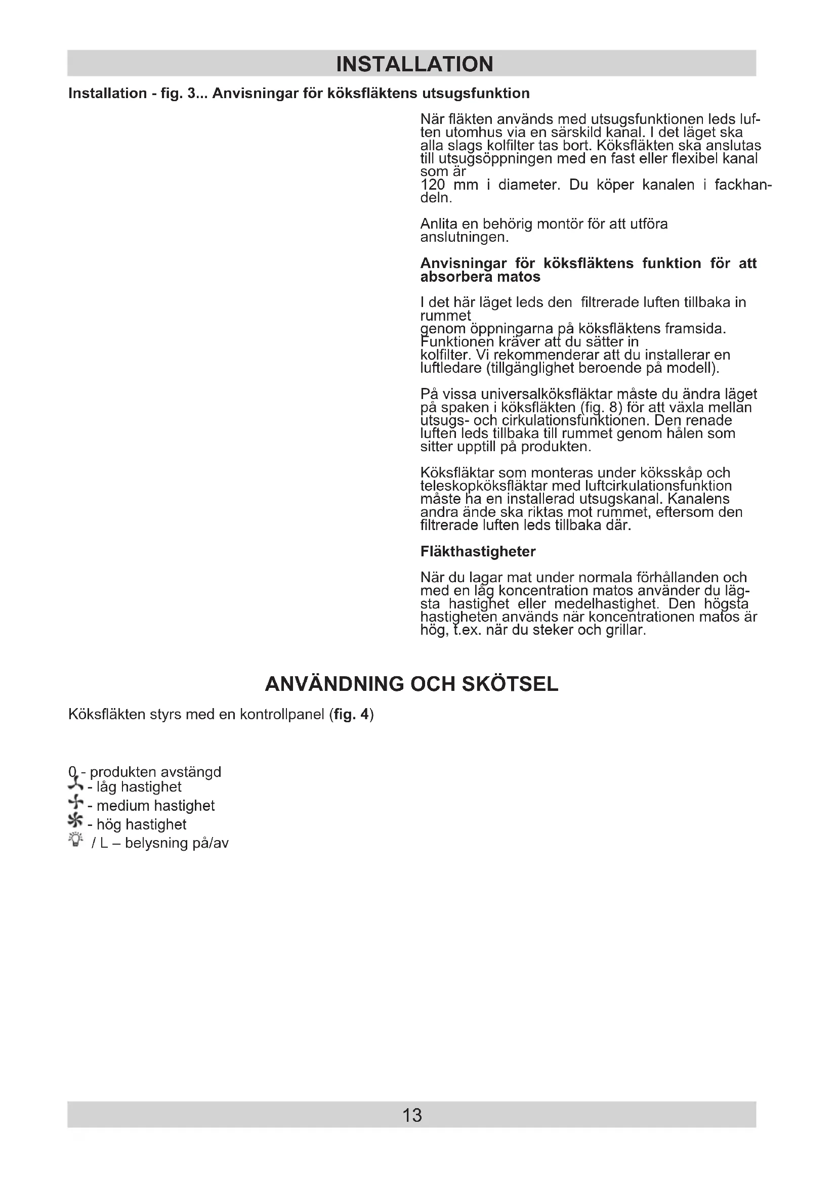 l Tillverkaren övertar in- get ansvar för skador som uppstår på grund av felaktig installation eller om köksäkten inte används enligt an- visningarna i denna ma- nual. l Köksäkten är avsedd för att avlägsna matos. Använd inte köksäkten för andra ändamål. l Anslut en köksäkt med utsugsfunktion till en passande ventila- tionskanal (anslut INTE till rök- eller rökgaska- naler som används). Det krävs att en luftut- sugskanal som leder utomhus installeras. Ka- nalen (i regel 120 eller 150 mm i diameter) bör inte vara längre än 4–5 m. En luftutsugskanal krävs även för köksäk- tar i teleskoputförande eller äktar som mon- teras under köksskåp om dessa är luftcirkula- tionsäktar. l Köksäktar med luftcirkulationsfunktion måste ha ett installerat aktivkollter. I så fall be- hövs ingen utsugskanal, men vi rekommenderar att du installerar en lu- ftledare (endast köks- äkt av skorstenstyp).
