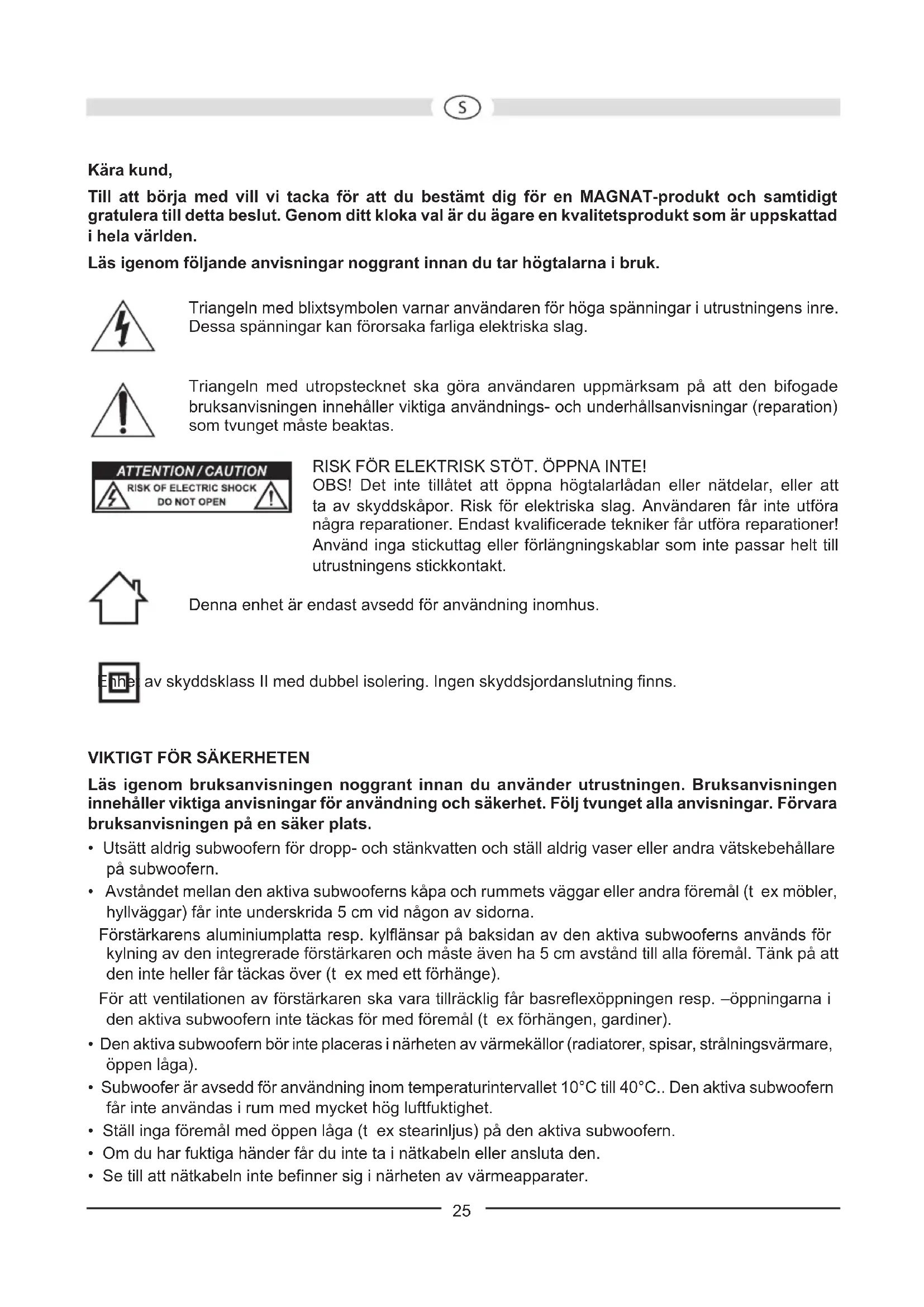 Configuração: Bassreflex subwoofer, ‚Frontfire‘ Equipamento Estágio excitador de curso longo de 30 cm Capacidade de saída RMS / Máx.: 140 / 280 Watt Faixa de frequência: 20...200 Hz Frequência de separação: 40...120 Hz regulável Dimensões (LxAxP): 355 x 475 x 435 mm Acessórios: Cabo de ligação à rede RESERVADOS OS DIREITOS DE ALTERAÇÕES TÉCNICAS.25 Kära kund, Till att börja med vill vi tacka för att du bestämt dig för en MAGNAT-produkt och samtidigt gratulera till detta beslut. Genom ditt kloka val är du ägare en kvalitetsprodukt som är uppskattad i hela världen. Läs igenom följande anvisningar noggrant innan du tar högtalarna i bruk. Triangeln med blixtsymbolen varnar användaren för höga spänningar i utrustningens inre. Dessa spänningar kan förorsaka farliga elektriska slag. Triangeln med utropstecknet ska göra användaren uppmärksam på att den bifogade bruksanvisningen innehåller viktiga användnings- och underhållsanvisningar (reparation) som tvunget måste beaktas. RISK FÖR ELEKTRISK STÖT. ÖPPNA INTE! OBS! Det inte tillåtet att öppna högtalarlådan eller nätdelar, eller att ta av skyddskåpor. Risk för elektriska slag. Användaren får inte utföra några reparationer. Endast kvalificerade tekniker får utföra reparationer! Använd inga stickuttag eller förlängningskablar som inte passar helt till utrustningens stickkontakt. Denna enhet är endast avsedd för användning inomhus. Enhet av skyddsklass II med dubbel isolering. Ingen skyddsjordanslutning finns.
