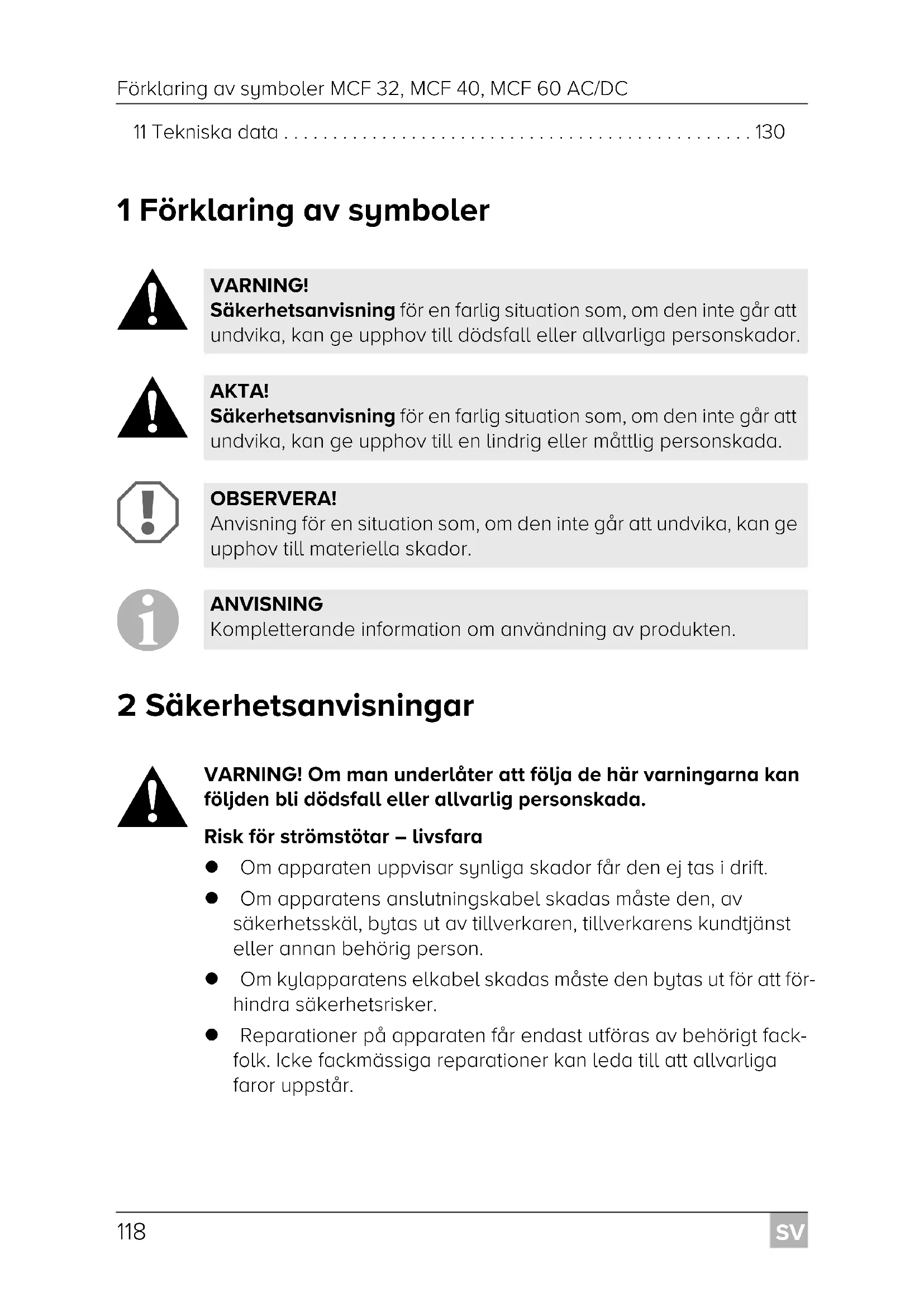 VARNING! Om man underlåter att följa de här varningarna kan följden bli dödsfall eller allvarlig personskada. Risk för strömstötar – livsfara Om apparaten uppvisar synliga skador får den ej tas i drift. Om apparatens anslutningskabel skadas måste den, av säkerhetsskäl, bytas ut av tillverkaren, tillverkarens kundtjänst eller annan behörig person. Om kylapparatens elkabel skadas måste den bytas ut för att för- hindra säkerhetsrisker. Reparationer på apparaten får endast utföras av behörigt fack- folk. Icke fackmässiga reparationer kan leda till att allvarliga faror uppstår. VARNING! Säkerhetsanvisning för en farlig situation som, om den inte går att undvika, kan ge upphov till dödsfall eller allvarliga personskador. AKTA! Säkerhetsanvisning för en farlig situation som, om den inte går att undvika, kan ge upphov till en lindrig eller måttlig personskada. OBSERVERA! Anvisning för en situation som, om den inte går att undvika, kan ge upphov till materiella skador. ANVISNING Kompletterande information om användning av produkten. FR34-FR40-FR60_MCF32-MCF40-MCF60_OPM_EMEA16.book Seite 118 Donnerstag, 13. Februar 2020 3:51 15SV