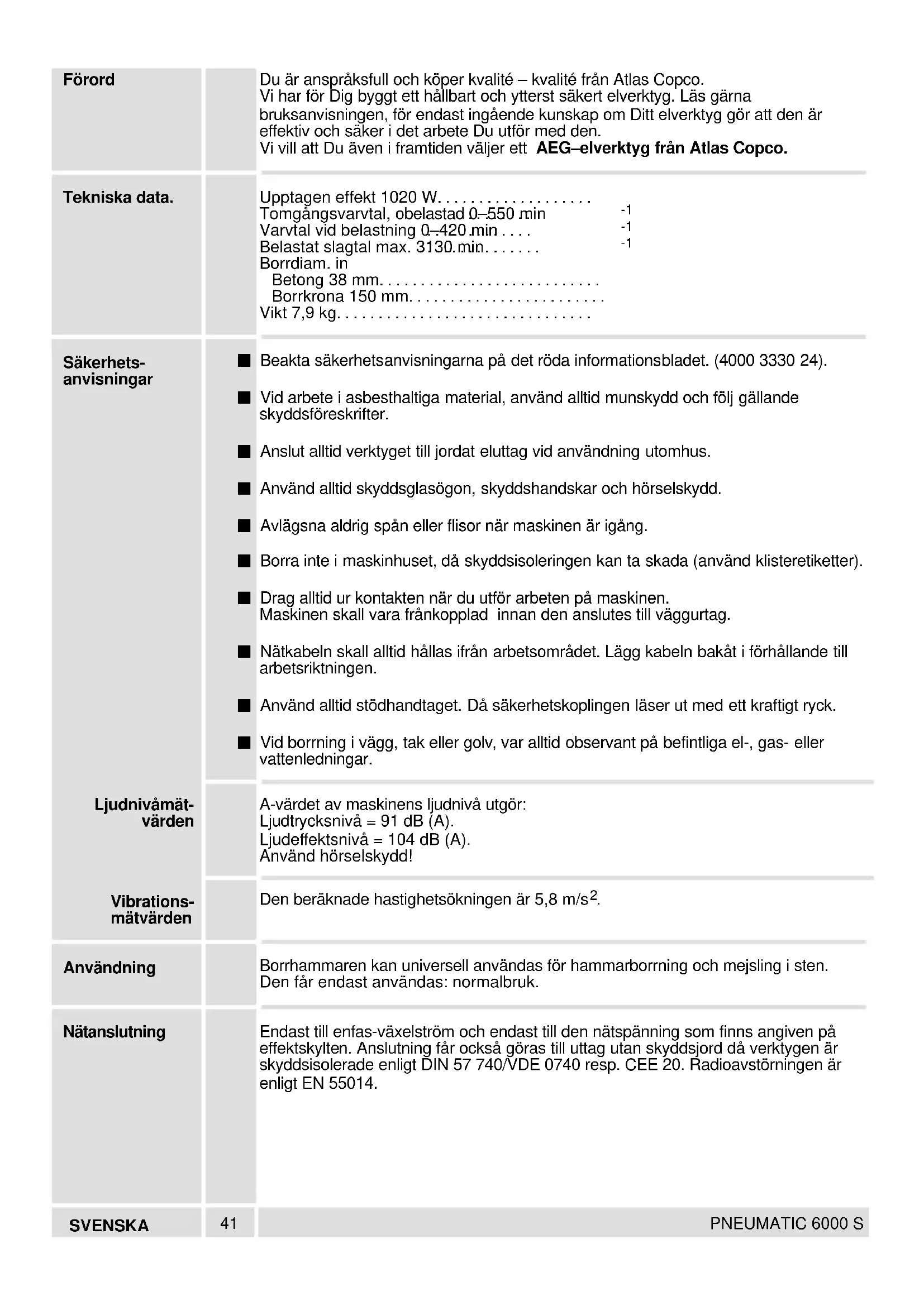 SVENSKA PNEUMATIC 6000 S Inkoppling: Strömbrytaren trycks in Urkoppling: Strömbrytaren släpps Varvtal regleras steglöst via strömbrytaren. Djupanslaget kan placeras på höger eller vänster sida om stödhandtaget.Djupanslaghållaren skjutes på stödhandtaget tills den är i rätt läge. För att ta bort djupanslaget, trycker man på låsanordningen och drar av djupanslaghållaren från handtaget. För att borra på lika djup, skjutes djupanslaget genom hållaren och klämmes fast vid önskat borrdjup. Stödhandtaget kan vridas; se fig. lossa på vingmutter vrid handtaget i önskad position och lås. Stödhandtaget kan även sättas på huset från sidan. Denna position lämpar sig bäst vid borrning nedåt (t ex i golvet) eller uppåt (t ex taket). Härvid skruvasstödhandtaget loss från den främre hållaren och skruvas fast i sidan på huset. In-/urkoppling Djupanslag Handtag45 SVENSKA PNEUMATIC 6000 S Ökat tryck ökar inte maskinens prestanda. Vid normalt tryck fungerar Anti-Vibrations-Systemet optimalt, härvid pressas den veckade bälge endast samman lätt. Vid alltför högt tryck, trycks den veckade bälgen samman starkt och vibrationerna överförs kännbart till handtaget. Drag med jämna mellanrum borren upp ur borrhålet för att utkasta dammet. i betong, hård tegel, sten och marmor koppla om till slagborrfunktion (OBS! Vid start i marmoranvändes ingen slagborrfunktion). i kakel, golvplattor, mjuka tegelsten användes endast borrfunktionen. använd borr med hårdmetallspets. för att undvika undanglidning vid borrning i t.ex. kakel tejpa borrstället. Vid minskad slageffekt sändes maskinen till vår kundservice för kontroll. Se till att motorhöljets luftslitsar är rena. Maskinen är utrustad med självbrytande kol som slå automatisk ifrån när de är nedslitna. Vid automatisk frånkoppling av kolborsten eller om slagkraften avtar: uppsök då auktoriserad AEG-serviceverkstad. Detta garanterar hög driftsäkerhet och förlengd livslängd. Förteckning över serviceverkstäder medföljer Använd endast AEG tillbehör och reservdelar. Byggdelar vars utbyte ej beskrives utväxlas bäst av AEG auktoriserad serviceverkstad. (beakta broschyrer Garanti/Kundtjänstadresser). Vid behov av sprängskiss, kan en sådan, genom att uppge maskinens art. nr. (som finns på typskylten) erhållas från: Atlas Copco Elektrowerkzeuge GmbH, Postfach 320, D–71361 Winnenden. Tillbehör med beställningsnummer finns i våra kataloger. Hanterings- anvisning Tips Skötsel Tillbehör46 SUOMI PNEUMATIC 6000 S Vaadit parasta ja ostat laatua – laatua, jota Atlas Copco tuottaa. Olemme valmistaneet käyttöösi luotettavan ja kestävän työkalun. Tämän työkalun tehokas ja terveydellesi vaaraton toiminta edellyttää kuitenkin sinulta perusteellista tutustumista näihin ohjeisiin ennen käyttöönottoa. Pyrimme siihen, että asiakkaamme olisivat tyytyväisiä sekä pysyisivät asiakkainamme ja ostaisivat Atlas Copco AEG sähkötyökaluja jatkossakin. Nimellisteho 1020 W. . . . . . . . . . . . . . . . . . . . . . . Kuormittamaton kierrosluku 0–550 min