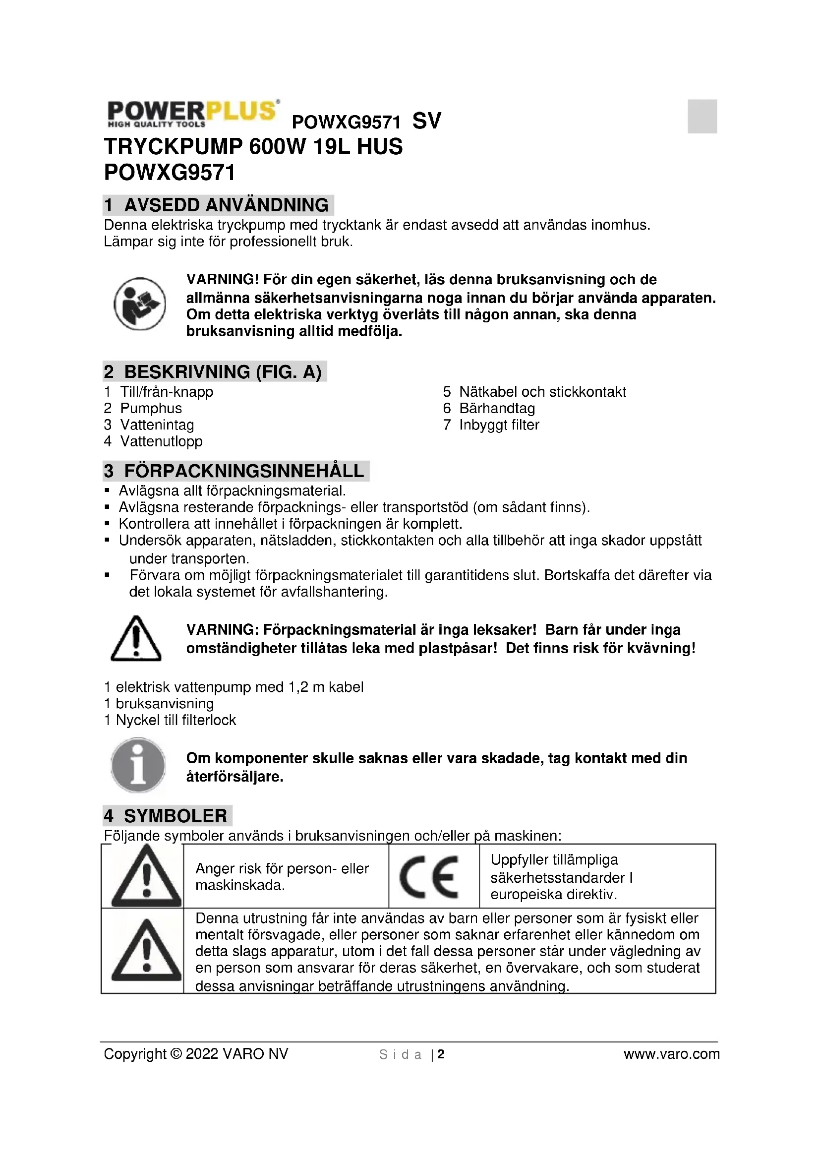 Då produkten tjänat ut får den inte lämnas med det vanliga hushållsavfallet utan ska deponeras på miljömässigt korrekt sätt och enligt gällande lokala bestämmelser. Avfall som kommer från elektriska maskinkomponenter får inte hanteras som vanligt hushållsavfall. De ska deponeras för återvinning där återvinningscentraler finns att tillgå. Kontakta lokala myndigheter eller din återförsäljare för närmare information om återvinning.POWXG9571 SV Copyright © 2022 VARO NV S i d a | 8 www.varo.com 14 KONFORMITETSDEKLARATION VARO N.V. – Vic. Van Rompuy N.V Joseph Van Instraat 9 – BE2500 Lier – Belgien, deklarerar härmed att, Produkt: Tryckpump 600W 19l Hus Varumärke: POWERplus Modell: POWXG9571 överensstämmer med väsentliga krav och andra relevanta bestämmelser i tillämpliga Europeiska direktiv, baserat på tillämpningen av Europeiska harmoniserade standarder. Varje ej godkänd ändring av apparaten gör denna deklaration ogiltig. Europeiska direktiv (inklusive, i tillämpliga fall, ändringar till dessa, fram till dagen för undertecknandet): 2011/65/EU 2014/35/EU 2014/30/EU 2014/68/EU 2000/14/EC Annex V LwA Measured 81dB(A) Guaranteed 82dB(A) Europeiska harmoniserade standarder (inklusive, i tillämpliga fall, ändringar till dessa, fram till dagen för undertecknandet): EN60335-1 : 2012 EN60335-2-41 : 2003