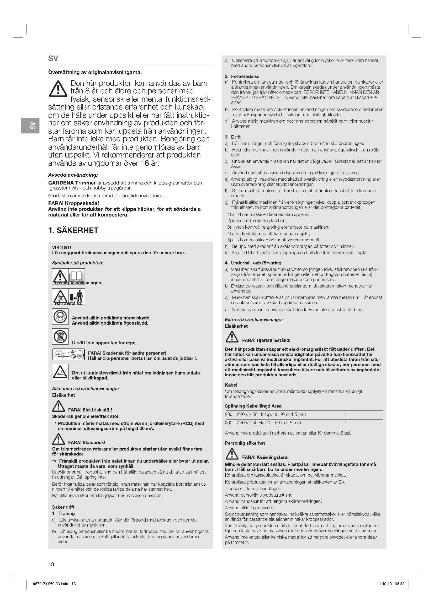 Översättning av originalanvisningarna. Den här produkten kan användas av barn från 8 år och äldre och personer med fysisk, sensorisk eller mental funktionsned- sättning eller bristande erfarenhet och kunskap, om de hålls under uppsikt eller har fått instruktio- ner om säker användning av produkten och för- står farorna som kan uppstå från användningen. Barn får inte leka med produkten. Rengöring och användarunderhåll får inte genomföras av barn utan uppsikt. Vi rekommenderar att produkten används av ungdomar över 16 år. Avsedd användning: GARDENA Trimmer är avsedd att trimma och klippa gräsmattor och gräsytor i villa- och hobby trädgårdar. Produkten är inte konstruerad för långtidsanvändning. FARA! Kroppsskada! Använd inte produkten för att klippa häckar, för att sönderdela material eller för att kompostera. c) Observera att användaren själv är ansvarig för olyckor eller faror som händer med andra personer eller deras egendom. 2 Förberedelse a) Kontrollera om anslutnings- och förlängnings kabeln har tecken på skador eller åldrande innan användningen. Om kabeln skadas under användningen måste den frånskiljas från nätet omedelbart. BERÖR INTE KABELN INNAN DEN ÄR FRÅNSKILD FRÅN NÄTET. Använd inte maskinen om kabeln är skadad eller sliten. b) Kontrollera maskinen optiskt innan använd ningen om skyddsanordningar eller -övertäckningar är skadade, saknas eller felaktigt ditsatta. c) Använd aldrig maskinen om det finns personer, särskilt barn, eller husdjur inärheten. 3 Drift a) Håll anslutnings- och förlängningskabeln borta från skäranordningen. b) Hela tiden när maskinen används måste man använda ögonskydd och rejäla skor. c) Undvik att använda maskinen när det är dåligt väder, särskilt när det är risk för åska. d) Använd endast maskinen i dagsljus eller god konstgjord belysning. e) Använd aldrig maskinen med skadad övertäckning eller skyddsanordning eller utan övertäckning eller skyddsanordningar. f) Sätt endast på motorn när händer och fötter är utom räckhåll för skäranord- ningen. g) Frånskilj alltid maskinen från elförsörjningen (dvs. koppla bort stickproppen från elnätet, ta bort spärranordningen eller det borttagbara batteriet)