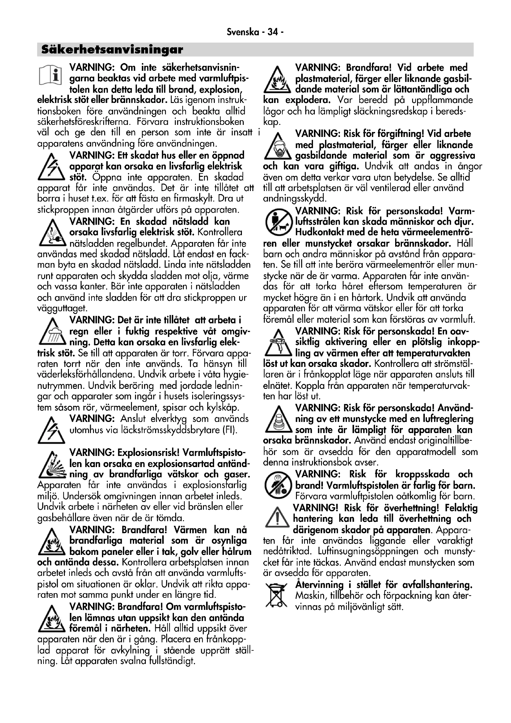 YSvenska - 34 - VARNING: Om inte säkerhetsanvisnin- garna beaktas vid arbete med varmluftpis- tolen kan detta leda till brand, explosion, elektrisk stöt eller brännskador. Läs igenom instruk- tionsboken före användningen och beakta alltid säkerhetsföreskrifterna. Förvara instruktionsboken väl och ge den till en person som inte är insatt i apparatens användning före användningen. VARNING: Ett skadat hus eller en öppnad apparat kan orsaka en livsfarlig elektrisk stöt. Öppna inte apparaten. En skadad apparat får inte användas. Det är inte tillåtet att borra i huset t.ex. för att fästa en firmaskylt. Dra ut stickproppen innan åtgärder utförs på apparaten. VARNING: En skadad nätsladd kan orsaka livsfarlig elektrisk stöt. Kontrollera nätsladden regelbundet. Apparaten får inte användas med skadad nätsladd. Låt endast en fack- man byta en skadad nätsladd. Linda inte nätsladden runt apparaten och skydda sladden mot olja, värme och vassa kanter. Bär inte apparaten i nätsladden och använd inte sladden för att dra stickproppen ur vägguttaget. VARNING: Det är inte tillåtet att arbeta i regn eller i fuktig respektive våt omgiv- ning. Detta kan orsaka en livsfarlig elek- trisk stöt. Se till att apparaten är torr. Förvara appa- raten torrt när den inte används. Ta hänsyn till väderleksförhållandena. Undvik arbete i våta hygie- nutrymmen. Undvik beröring med jordade lednin- gar och apparater som ingår i husets isoleringssys- tem såsom rör, värmeelement, spisar och kylskåp. VARNING: Anslut elverktyg som används utomhus via läckströmsskyddsbrytare (FI). VARNING: Explosionsrisk! Varmluftspisto- len kan orsaka en explosionsartad antänd- ning av brandfarliga vätskor och gaser. Apparaten får inte användas i explosionsfarlig miljö. Undersök omgivningen innan arbetet inleds. Undvik arbete i närheten av eller vid bränslen eller gasbehållare även när de är tömda. VARNING: Brandfara! Värmen kan nå brandfarliga material som är osynliga bakom paneler eller i tak, golv eller hålrum och antända dessa. Kontrollera arbetsplatsen innan arbetet inleds och avstå från att använda varmlufts- pistol om situationen är oklar. Undvik att rikta appa- raten mot samma punkt under en längre tid. VARNING: Brandfara! Om varmluftspisto- len lämnas utan uppsikt kan den antända föremål i närheten. Håll alltid uppsikt över apparaten när den är i gång. Placera en frånkopp- lad apparat för avkylning i stående upprätt ställ- ning. Låt apparaten svalna fullständigt. VARNING: Brandfara! Vid arbete med plastmaterial, färger eller liknande gasbil- dande material som är lättantändliga och kan explodera. Var beredd på uppflammande lågor och ha lämpligt släckningsredskap i bereds- kap. VARNING: Risk för förgiftning! Vid arbete med plastmaterial, färger eller liknande gasbildande material som är aggressiva och kan vara giftiga. Undvik att andas in ångor även om detta verkar vara utan betydelse. Se alltid till att arbetsplatsen är väl ventilerad eller använd andningsskydd. VARNING: Risk för personskada! Varm- luftsstrålen kan skada människor och djur. Hudkontakt med de heta värmeelementrö- ren eller munstycket orsakar brännskador. Håll barn och andra människor på avstånd från appara- ten. Se till att inte beröra värmeelementrör eller mun- stycke när de är varma. Apparaten får inte använ- das för att torka håret eftersom temperaturen är mycket högre än i en hårtork. Undvik att använda apparaten för att värma vätskor eller för att torka föremål eller material som kan förstöras av varmluft. VARNING: Risk för personskada! En oav- siktlig aktivering eller en plötslig inkopp- ling av värmen efter att temperaturvakten löst ut kan orsaka skador. Kontrollera att strömstäl- laren är i frånkopplat läge när apparaten ansluts till elnätet. Koppla från apparaten när temperaturvak- ten har löst ut. VARNING: Risk för personskada! Använd- ning av ett munstycke med en luftreglering som inte är lämpligt för apparaten kan orsaka brännskador. Använd endast originaltillbe- hör som är avsedda för den apparatmodell som denna instruktionsbok avser. VARNING: Risk för kroppsskada och brand! Varmluftspistolen är farlig för barn. Förvara varmluftpistolen oåtkomlig för barn. VARNING! Risk för överhettning! Felaktig hantering kan leda till överhettning och därigenom skador på apparaten. Appara- ten får inte användas liggande eller varaktigt nedåtriktad. Luftinsugningsöppningen och munsty- cket får inte täckas. Använd endast munstycken som är avsedda för apparaten. Återvinning i stället för avfallshantering. Maskin, tillbehör och förpackning kan åter- vinnas på miljövänligt sätt. SäkerhetsanvisningarSvenska - 35 - Denna varmluftspistol är avsedd för all sådan varmluftsanvändning som anges i denna instruktionsbok under förutsättning att säkerhetsföreskrifterna följs och originaltillbehör används. Ett munstycke som tappas kan antända ett föremål. Munstyckena måste monteras stadigt och säkert på apparaten. Beröring av det heta munstycket kan orsaka svåra brännskador. Låt apparaten svalan helt innan munstycket monteras eller byts, eller använd ett lämpligt verktyg. Ett hett munstycke kan antända underlaget. Placera ett hett munstycke på ett brandsäkert underlag. Ett felaktigt eller defekt munstycke kan orsaka att varmluften strömmar bakåt och skadar appara- ten. Använd endast de originalmunstycken i tabellen som är avsedda för apparaten. Tekniska data A B C Spänning [V] 230 120 100 230 120 100 230 120 100 Frekvens [Hz] 50/60 50/60 50/60 Effekt [W] 1600 1200 1100 1800 1400 1200 2000 1500 1300 Strömförbrukning [A] 7 10 11 8 12 12 9 13 13 Omkopplarsteg 0 - l - ll 0 - l - ll 0 - l Steg I II I II I II Manuellt inställd Elektroniskt inställd och reglerad Temperatur [°C] 350 500 500 500 100–550 80–550 80–550 80–650 80–650 80–650 [°F] 660 9