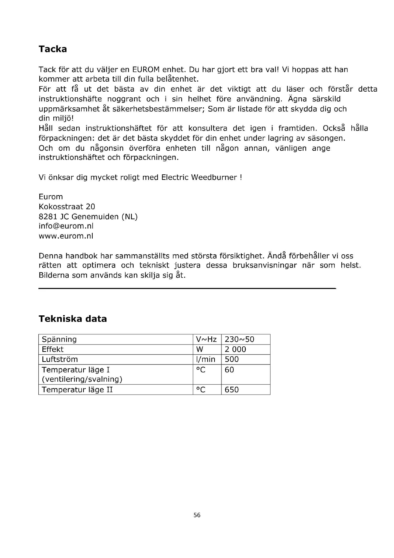 EN 60335-1:2012+A11:2014 EN 55014-1:2017 EN 60335-2-34:2002+A1:2008+A2:2012 EN 55014-2:2015 EN 62233:2008 EN 61000-3-2:2014 EN 61000-3-3:2013 RoHS 2011/65/EU&(EU)2015/863 Genemuiden, 31-10-2019 W.J. Bakker, alg. dir.56 Tacka Tack för att du väljer en EUROM enhet. Du har gjort ett bra val! Vi hoppas att han kommer att arbeta till din fulla belåtenhet. För att få ut det bästa av din enhet är det viktigt att du läser och förstår detta instruktionshäfte noggrant och i sin helhet före användning. Ägna särskild uppmärksamhet åt säkerhetsbestämmelser; Som är listade för att skydda dig och din miljö! Håll sedan instruktionshäftet för att konsultera det igen i framtiden. Också hålla förpackningen: det är det bästa skyddet för din enhet under lagring av säsongen. Och om du någonsin överföra enheten till någon annan, vänligen ange instruktionshäftet och förpackningen. Vi önksar dig mycket roligt med Electric Weedburner ! Eurom Kokosstraat 20 8281 JC Genemuiden (NL) info@eurom.nl www.eurom.nl Denna handbok har sammanställts med största försiktighet. Ändå förbehåller vi oss rätten att optimera och tekniskt justera dessa bruksanvisningar när som helst. Bilderna som används kan skilja sig åt.