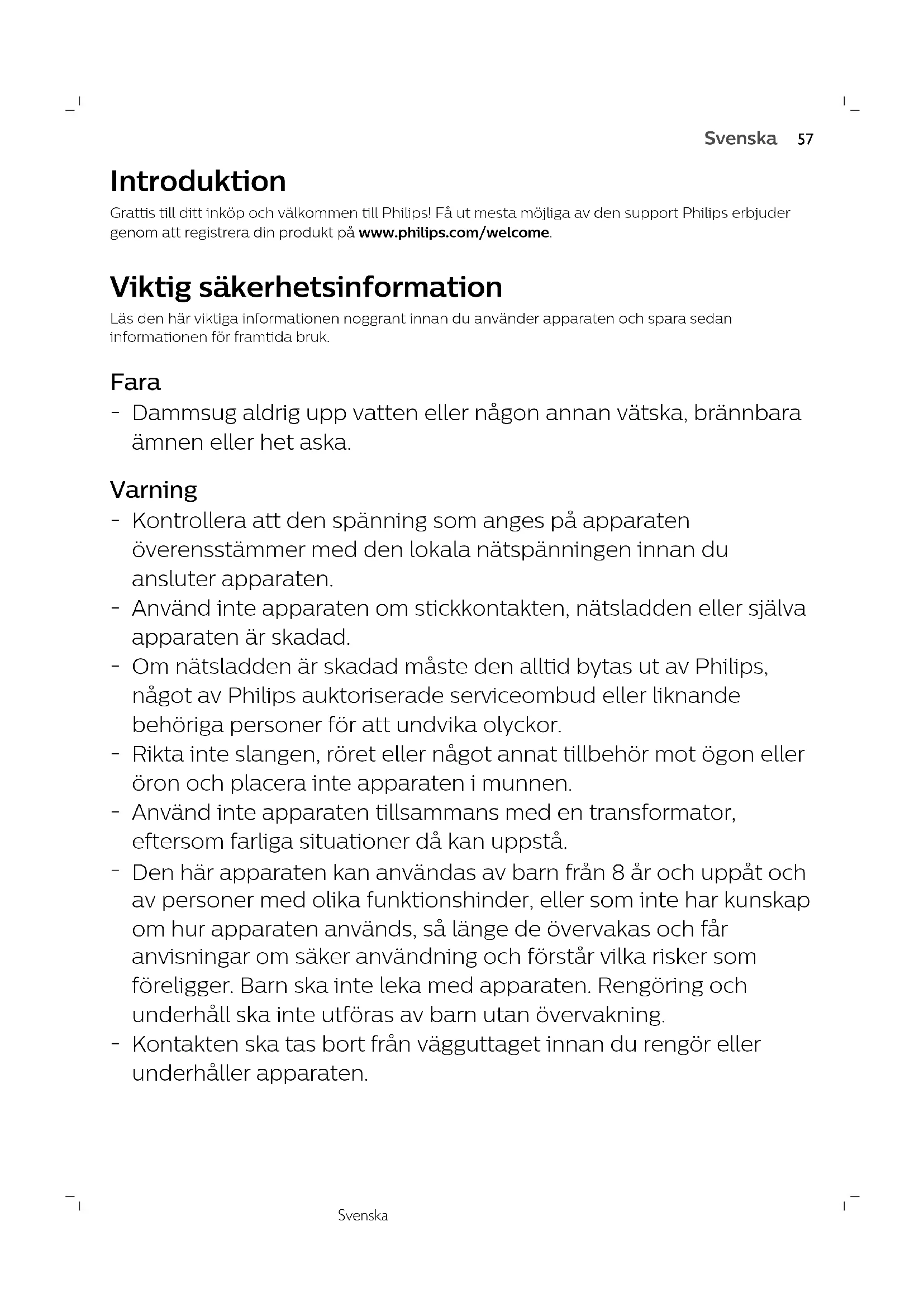 SuomiSvenska Introduktion Grattis till ditt inköp och välkommen till Philips! Få ut mesta möjliga av den support Philips erbjudergenom att registrera din produkt på www.philips.com/welcome. Viktig säkerhetsinformation Läs den här viktiga informationen noggrant innan du använder apparaten och spara sedaninformationen för framtida bruk. Fara