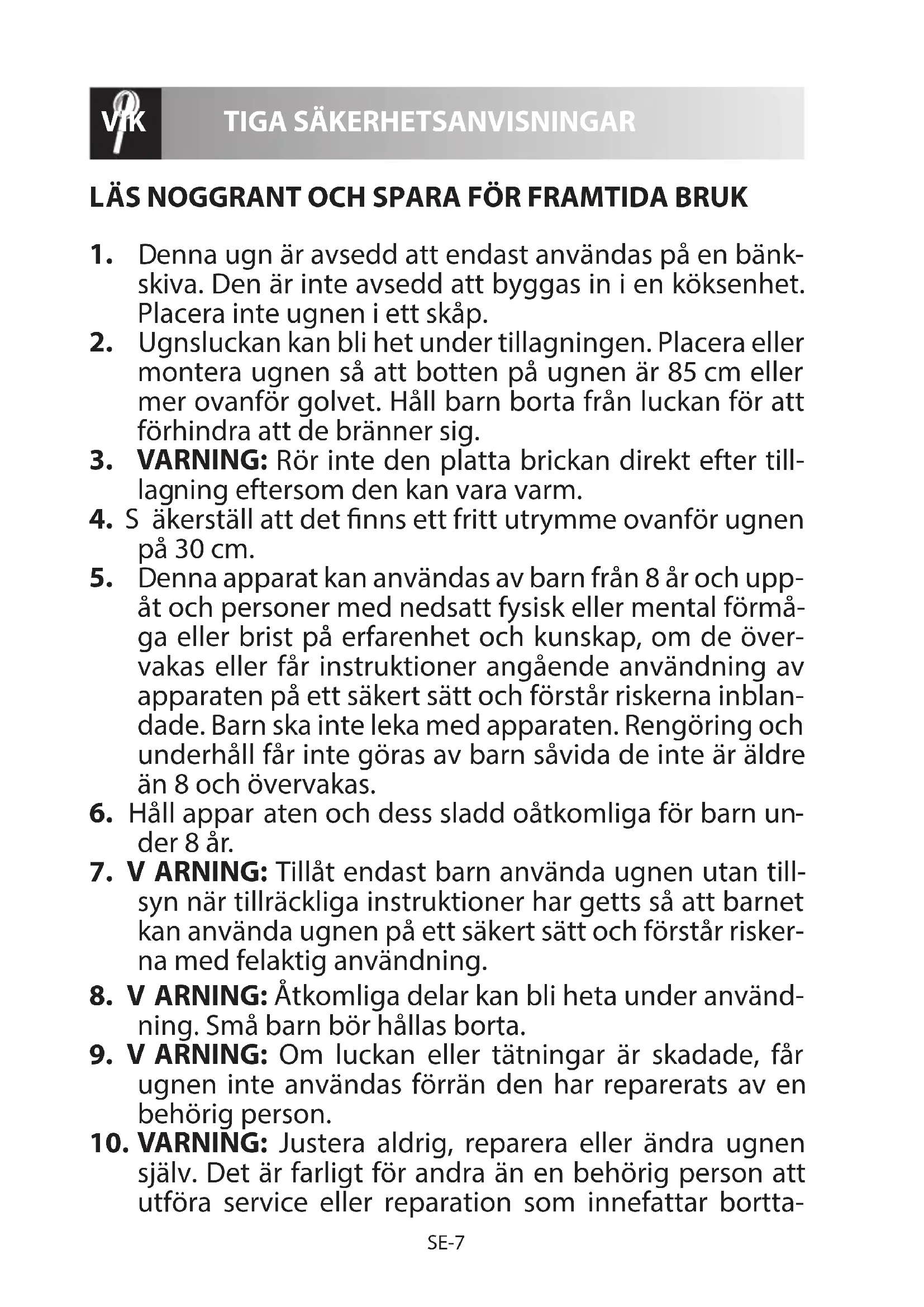 ARNING: Tillåt endast barn använda ugnen utan till- syn när tillräckliga instruktioner har getts så att barnet kan använda ugnen på ett säkert sätt och förstår risker- na med felaktig användning.