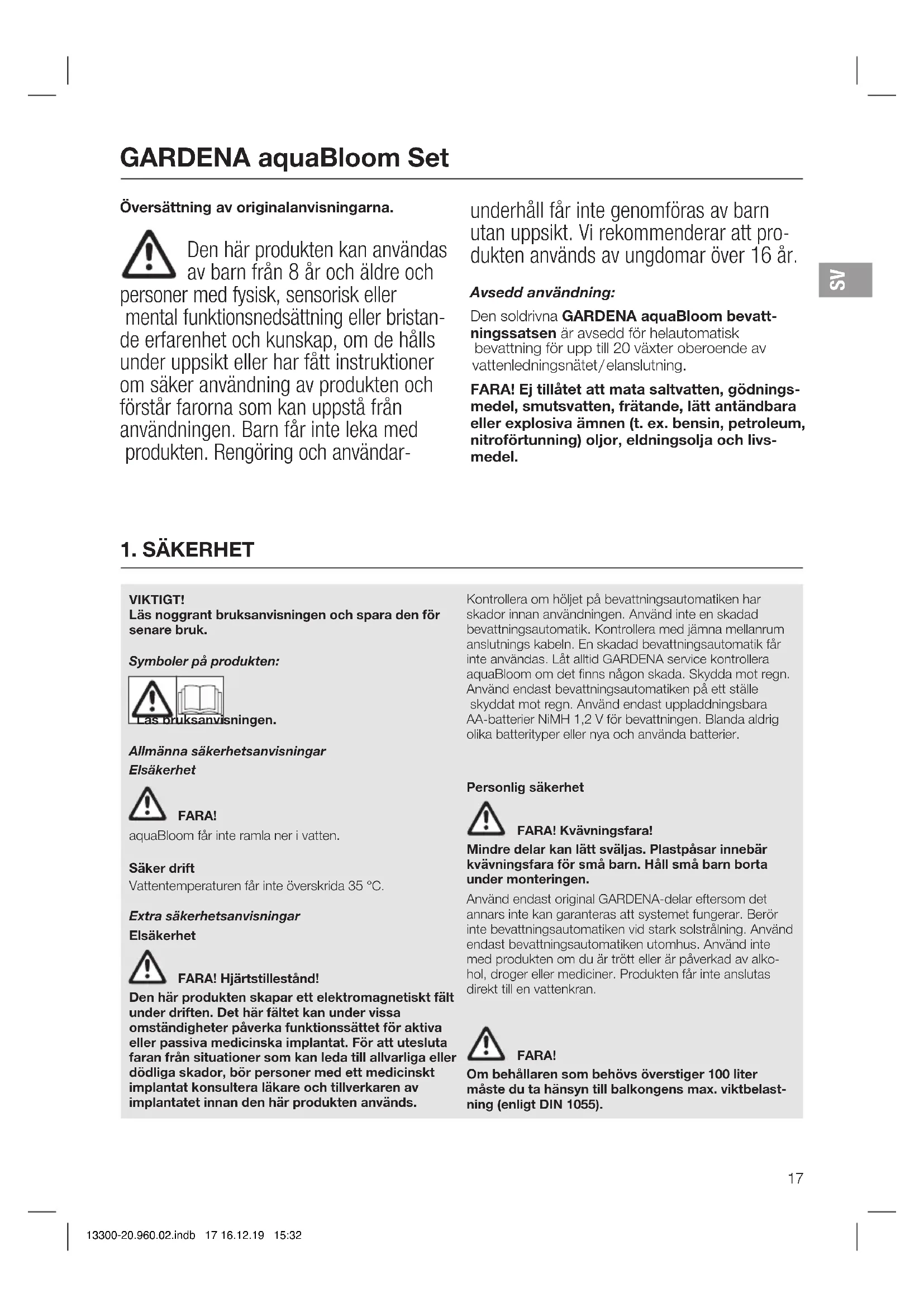 13300-20.960.02.indb 16 16.12.19 15:32Översättning av originalanvisningarna. Den här produkten kan användas av barn från 8 år och äldre och personer med fysisk, sensorisk eller mental funktionsnedsättning eller bristan- de erfarenhet och kunskap, om de hålls under uppsikt eller har fått instruktioner om säker användning av produkten och förstår farorna som kan uppstå från användningen. Barn får inte leka med produkten. Rengöring och användar- underhåll får inte genomföras av barn utan uppsikt. Vi rekommenderar att pro- dukten används av ungdomar över 16 år. Avsedd användning: Den soldrivna GARDENA aquaBloom bevatt- ningssatsen är avsedd för helautomatisk bevattning för upp till 20 växter oberoende av vattenledningsnätet / elanslutning. FARA! Ej tillåtet att mata saltvatten, gödnings- medel, smutsvatten, frätande, lätt antändbara eller explosiva ämnen (t. ex. bensin, petroleum, nitroförtunning) oljor, eldningsolja och livs- medel.