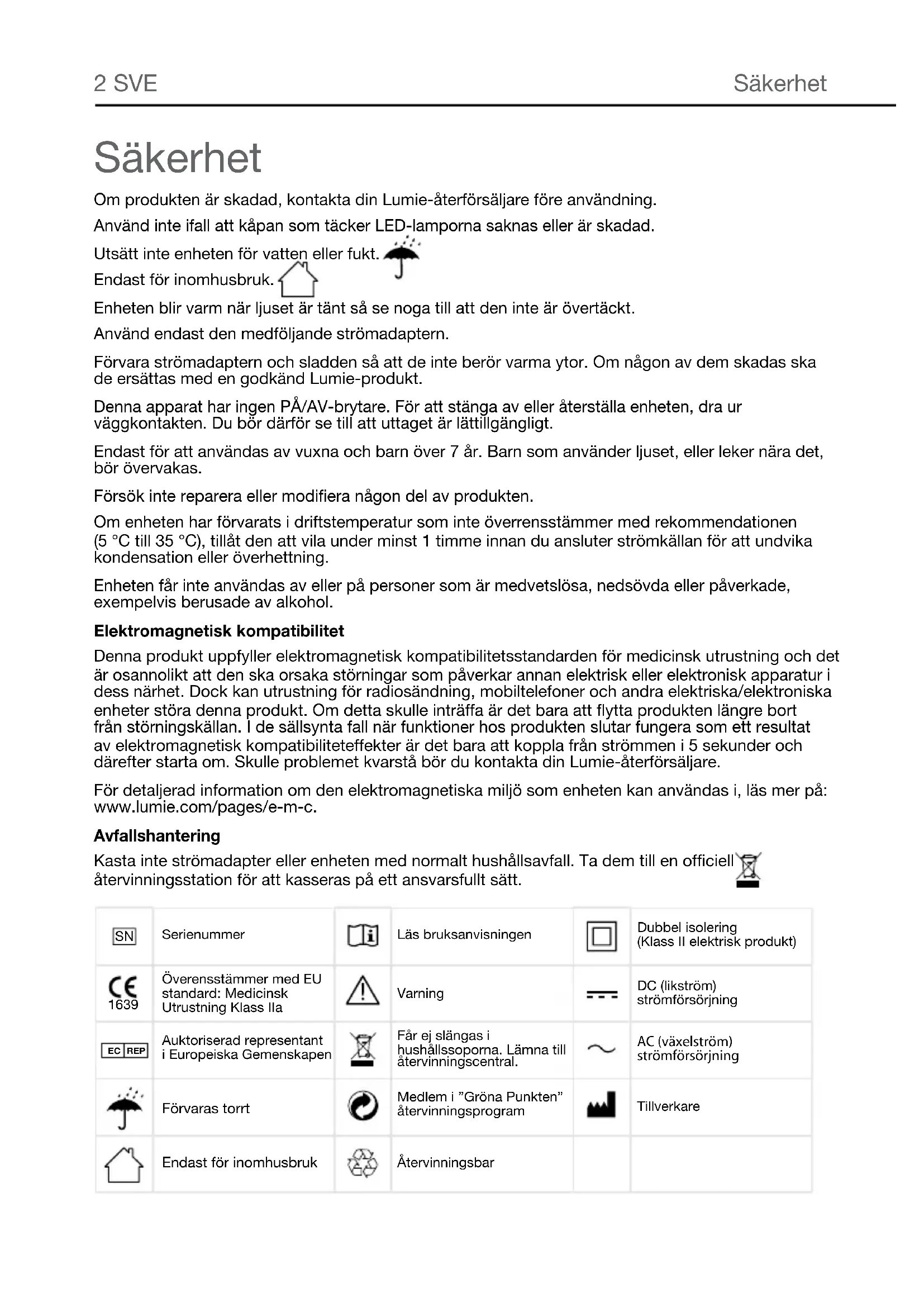 REP Advena Ltd, Tower Business Centre, 2nd Floor, Tower Street, Swatar, BKR 4013 Malta. Technische DatenZest SVE2 SVE Säkerhet Om produkten är skadad, kontakta din Lumie-återförsäljare före användning. Använd inte ifall att kåpan som täcker LED-lamporna saknas eller är skadad. Utsätt inte enheten för vatten eller fukt. Endast för inomhusbruk. Enheten blir varm när ljuset är tänt så se noga till att den inte är övertäckt. Använd endast den medföljande strömadaptern. Förvara strömadaptern och sladden så att de inte berör varma ytor. Om någon av dem skadas ska de ersättas med en godkänd Lumie-produkt. Denna apparat har ingen PÅ/AV-brytare. För att stänga av eller återställa enheten, dra ur väggkontakten. Du bör därför se till att uttaget är lättillgängligt. Endast för att användas av vuxna och barn över 7 år. Barn som använder ljuset, eller leker nära det, bör övervakas. Försök inte reparera eller modifiera någon del av produkten. Om enheten har förvarats i driftstemperatur som inte överrensstämmer med rekommendationen (5 °C till 35 °C), tillåt den att vila under minst 1 timme innan du ansluter strömkällan för att undvika kondensation eller överhettning. Enheten får inte användas av eller på personer som är medvetslösa, nedsövda eller påverkade, exempelvis berusade av alkohol. Elektromagnetisk kompatibilitet Denna produkt uppfyller elektromagnetisk kompatibilitetsstandarden för medicinsk utrustning och det är osannolikt att den ska orsaka störningar som påverkar annan elektrisk eller elektronisk apparatur i dess närhet. Dock kan utrustning för radiosändning, mobiltelefoner och andra elektriska/elektroniska enheter störa denna produkt. Om detta skulle inträffa är det bara att flytta produkten längre bort från störningskällan. I de sällsynta fall när funktioner hos produkten slutar fungera som ett resultat av elektromagnetisk kompatibiliteteffekter är det bara att koppla från strömmen i 5 sekunder och därefter starta om. Skulle problemet kvarstå bör du kontakta din Lumie-återförsäljare. För detaljerad information om den elektromagnetiska miljö som enheten kan användas i, läs mer på: www.lumie.com/pages/e-m-c. Avfallshantering Kasta inte strömadapter eller enheten med normalt hushållsavfall. Ta dem till en officiell återvinningsstation för att kasseras på ett ansvarsfullt sätt. Säkerhet