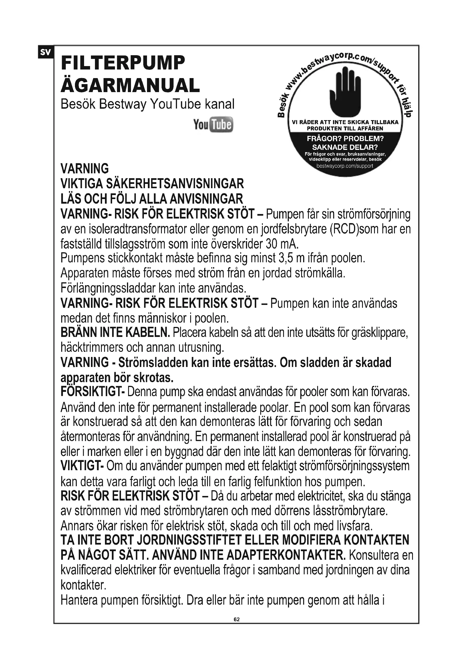 VARNINGVIKTIGA SÄKERHETSANVISNINGARLÄS OCH FÖLJ ALLA ANVISNINGARVARNING- RISK FÖR ELEKTRISK STÖT – Pumpen får sin strömförsörjning av en isoleradtransformator eller genom en jordfelsbrytare (RCD)som har en fastställd tillslagsström som inte överskrider 30 mA.Pumpens stickkontakt måste befinna sig minst 3,5 m ifrån poolen.Apparaten måste förses med ström från en jordad strömkälla.Förlängningssladdar kan inte användas.VARNING- RISK FÖR ELEKTRISK STÖT – Pumpen kan inte användas medan det finns människor i poolen. BRÄNN INTE KABELN. Placera kabeln så att den inte utsätts för gräsklippare, häcktrimmers och annan utrusning.VARNING - Strömsladden kan inte ersättas. Om sladden är skadadapparaten bör skrotas. FÖRSIKTIGT- Denna pump ska endast användas för pooler som kan förvaras. Använd den inte för permanent installerade poolar. En pool som kan förvaras är konstruerad så att den kan demonteras lätt för förvaring och sedan återmonteras för användning. En permanent installerad pool är konstruerad på eller i marken eller i en byggnad där den inte lätt kan demonteras för förvaring. VIKTIGT- Om du använder pumpen med ett felaktigt strömförsörjningssystem kan detta vara farligt och leda till en farlig felfunktion hos pumpen. RISK FÖR ELEKTRISK STÖT – Då du arbetar med elektricitet, ska du stänga av strömmen vid med strömbrytaren och med dörrens låsströmbrytare. Annars ökar risken för elektrisk stöt, skada och till och med livsfara.TA INTE BORT JORDNINGSSTIFTET ELLER MODIFIERA KONTAKTEN PÅ NÅGOT SÄTT. ANVÄND INTE ADAPTERKONTAKTER. Konsultera en kvalificerad elektriker för eventuella frågor i samband med jordningen av dina kontakter. Hantera pumpen försiktigt. Dra eller bär inte pumpen genom att hålla i strömkabeln. Dra aldrig ut en kontakt ur uttaget genom att rycka i kabeln. Skydda kabeln mot avskavningar. Utsätt aldrig filterpumpen för vassa föremål, olja, rörliga delar eller värme. VARNING- Denna apparat kan användas av barn från 8 års ålder och personer med nedsatt fysisk, sensorisk eller mental kapacitet eller brist på erfarenhet och kunskap om de är under uppsyn eller har instruerats gällande apparetens sacra användande och förstår farorna I samband med användandet. Barn bör inte leka med apparaten. Rengöring och underhåll skall inte göras av barn utan tillsyn. (För EU) VARNING- Denna apparat är ej avsedd att användas av personer (däribland barn), med begränsad fysisk, mental eller sensoriskt förmåga, eller bristande erfarenhet och kunskap, om inte denne har under uppsyn och instruktion om apparatens användning av en person som är ansvarig för dennes säkerhet. Barn bör hållas under uppsyn så de ej leker med apparaten. (För länder utanför EU)Rengöring och underhåll måste utföras av en vuxen, 18 år eller äldre, som är bekant med farorna med elektriska stötar. När apparaten ej används under en längre tid, såsom under vintern, ska poolsatsen demonteras och förvaras inomhus. VARNING! Läs instruktionerna innan apparaten tas i bruk och före varje installation/montering.Apparaten måste placeras minst 2 m från poolen. (Endast för Frankrike). Elektriska installationer måste stämma överens med lokala regelverk. Kontrollera med en kvalificerad elektriker om du har några frågor. Enbart de delar som följer med eller som anges av tillverkaren skall användas vid installation.Det är mycket viktigt att kontrollera att de sugöppningarna inte är blockerade.Det rekommenderas att stoppa filtreringen när underhåll utförs på filtreringssystemet.Övervaka regelbundet filtrets tilltäppningsnivå.Kontroll för ev. rengöring rekommenderas en gång i veckan. Det rekommenderas att köra filtrering minst i 8 timmar per dag för att garantera klart poolvatten. Det är viktigt att byta ut skadade delar så snart som möjligt. Använd enbart godkända reservdelar från den som är ansvarig för marknadsföringen. Alla filter och filterdelar ska kontrolleras regelbundet för att säkerställa att det inte blir smutsansamlingar som hindrar en god filtrering. Filter och filterdelar kasserasi enlighet med lokala föreskrifter/lagstiftning. Vid frågor kring pumpen eller cirkulationsenheter, kontakta installatören, eller tillverkare/importör/distributör.Installation av vattencirkulation skall överensstämma med EU-regler samt nationella/lokala regelverk, särskilt när det kommer till elinstallationer. Alla ev. ändringar av ventilers placering, pumpstorlek, gallerstorlek kan orsaka förändringar i flödet och sughastigheten kan öka. Ta alla säkerhetsföreskrifter och rekommendationer som beskrivs i manualen i beaktande.OBS:Undersök utrustningen före användning. Informera Bestway på kundserviceadressen som anges i bruksanvisningen om eventuella fabrikationsfel eller delar som saknades vid inköpstillfället. Kontrollera att utrustningens beståndsdelar motsvarar filterpumpsmodellen du önskade köpa.OBS: Placera pumpen på ett stadigt och jämnt underlag. Var noga med poolens och pumpens placering så att en lämplig ventilation, tömning och åtkomst för rengöring finns tillgänglig. Placera aldrig pumpen i ett område där den kan samla vatten eller i ett område där man hela tiden går runt poolen.Kontakten ska vara tillgänglig efter poolens installation.OBS:Väderförhållanden kan påverka din filterpumps prestanda och livslängd. Var noga med att skydda filterpumpen mot onödigt slitage som kan ske under perioder av kyla, värme och då den är utsatt för sol.OBS: Tillsätt aldrig kemikalier i filterpumpen i ett område där poolen är åtkomlig för rengöring.Koppla inte i eller ur apparaten med våta hander.Koppla alltid ur apparaten:• På regniga dagar• Innan rengöring eller annat underhåll• Lämna den obevakad under semestern Säker förvaring av instruktionerna. För återuppbyggnad av poolsetet, vänligen kontrollera instruktionerna varje 