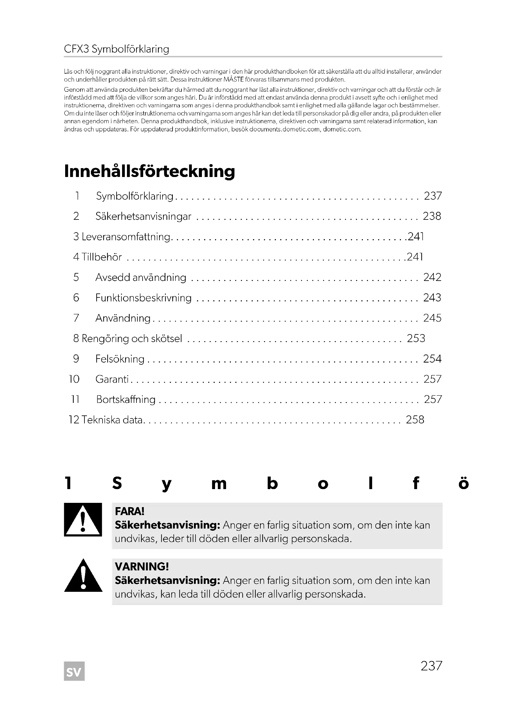 - Läs och följ noggrant alla instruktioner, direktiv och varningar i den här produkthandboken för att säkerställa att du alltid installerar, använder och underhåller produkten på rätt sätt. Dessa instruktioner MÅSTE förvaras tillsammans med produkten. Genom att använda produkten bekräftar du härmed att du noggrant har läst alla instruktioner, direktiv och varningar och att du förstår och är införstådd med att följa de villkor som anges häri. Du är införstådd med att endast använda denna produkt i avsett syfte och i enlighet med instruktionerna, direktiven och varningarna som anges i denna produkthandbok samt i enlighet med alla gällande lagar och bestämmelser. Om du inte läser och följer instruktionerna och varningarna som anges här kan det leda till personskador på dig eller andra, på produkten eller annan egendom i närheten. Denna produkthandbok, inklusive instruktionerna, direktiven och varningarna samt relaterad information, kan ändras och uppdateras. För uppdaterad produktinformation, besök documents.dometic.com, dometic.com. Innehållsförteckning 1 Symbolförklaring p. 237