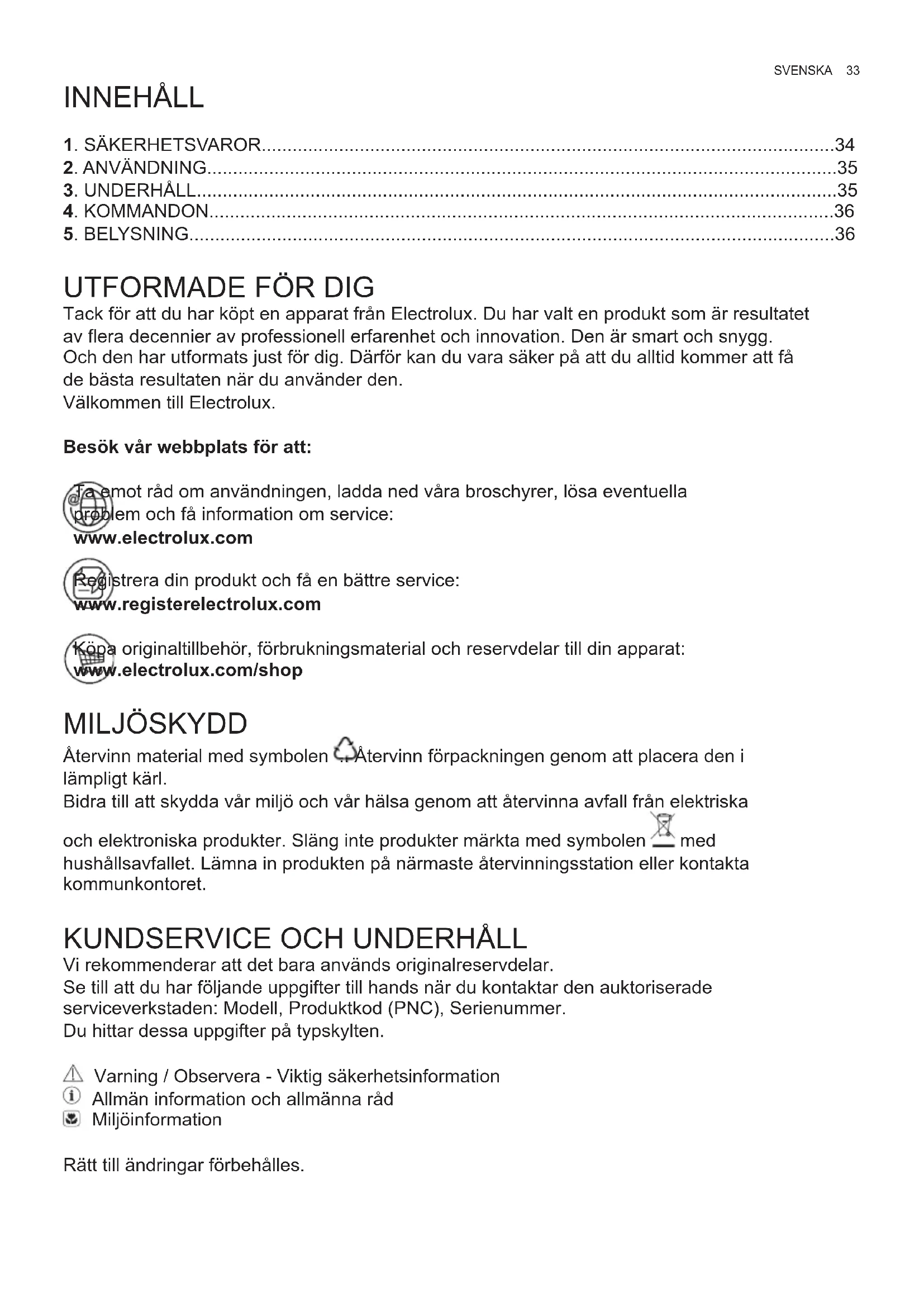 Vi rekommenderar att det bara används originalreservdelar. Se till att du har följande uppgifter till hands när du kontaktar den auktoriserade serviceverkstaden: Modell, Produktkod (PNC), Serienummer. Du hittar dessa uppgifter på typskylten. Varning / Observera - Viktig säkerhetsinformation Allmän information och allmänna råd Miljöinformation Rätt till ändringar förbehålles. SVENSKA34 www.electrolux.com