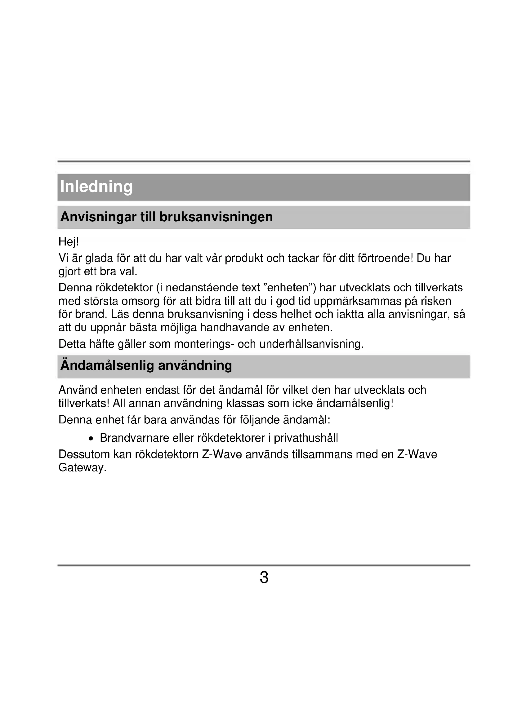 - Prestandadeklaration Inledning Anvisningar till bruksanvisningen Hej! Vi är glada för att du har valt vår produkt och tackar för ditt förtroende! Du har gjort ett bra val. Denna rökdetektor (i nedanstående text ”enheten”) har utvecklats och tillverkats med största omsorg för att bidra till att du i god tid uppmärksammas på risken för brand. Läs denna bruksanvisning i dess helhet och iaktta alla anvisningar, så att du uppnår bästa möjliga handhavande av enheten. Detta häfte gäller som monterings- och underhållsanvisning. Ändamålsenlig användning Använd enheten endast för det ändamål för vilket den har utvecklats och tillverkats! All annan användning klassas som icke ändamålsenlig! Denna enhet får bara användas för följande ändamål: Brandvarnare eller rökdetektorer i privathushåll Dessutom kan rökdetektorn Z-Wave används tillsammans med en Z-Wave Gateway.4 Ansvarsbegränsning Dina rättigheter inskränker sig till reparation eller byte av denna produkt i det skick som den levererades i. ABUS Security Center övertar inget ansvar för några speciella, oförutsedda eller påföljande skador, inklusive men inte begränsat till förlust av avkastning eller vinster, inskränkningar vid användning av programvaran, förlust eller återskapande av data, kostnader för utbytesutrustning, stilleståndstider, materiella skador och krav från tredje part till följd av bl.a. utifrån garantin uppstående, avtalsenliga, lagliga eller skadeståndsrättsliga anspråk på återställande, oavsett andra begränsade eller enligt lag underförstådda garantibestämmelser, eller för det fall att denna garantibegränsning inte gäller begränsas ansvarsskyldigheten för ABUS Security Center till produktens inköpspris. Innehållet i denna bruksanvisning kan ändras utan förvarning. © ABUS Security-Center GmbH & Co. KG, 08/20185 Säkerhetsanvisningar Symbolförklaring Följande symboler används i bruksanvisningen och på enheten: Symbol Signalord Innebörd p. 263