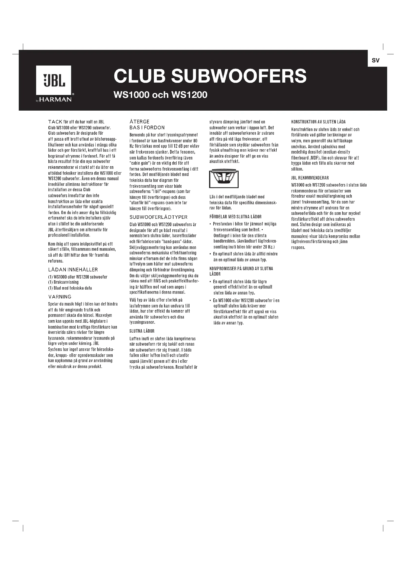 (1) WS1000 eller WS1200 subwoofer (1) Bruksanvisning (1) Blad med t ekniska data VARNING Spelar du musik högt i bilen kan det hindra att du hör omgivande trafik och permanent skada din hörsel. Maxvolym som kan uppnås med JBL-högtalare i kombination med kraftiga förstärkare kan överskrida säkra nivåer för längre lyssnande. rekommenderar lyssnande på lägre volym under körning. JBL Systems har inget ansvar för hörselska- dor, kropps- eller egendomsskador som kan uppkomma på grund av användning eller missbruk av denna produkt. styvare dämpning jämfört med en subwoofer som verkar i öppen luft. Det innebär att subwooferkonen är svårare att röra på vid låga frekvenser, ett förhållande som skyddar subwoofern från fysisk utmattning men kräver mer effekt än andra designer för att ge en viss akustisk uteffekt. Läs i det medföljande bladet med tekniska data för specifika dimensionsk- rav för lådan.