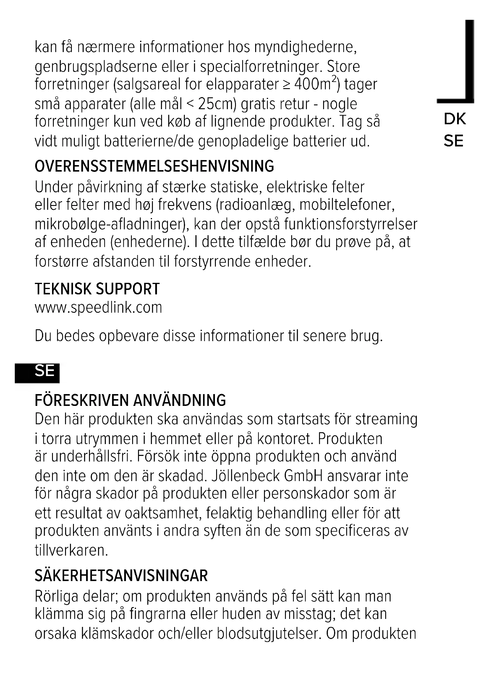 Starka statiska, elektriska och högfrekventa fält (radioan- läggningar, mobiltelefoner, urladdningar från mikrovågsugnar) kan påverka apparatens/apparaternas funktion. I så fall ska du försöka öka avståndet till den apparat som stör. TEKNISK SUPPORT www.speedlink.com Spara den här informationen för senare bruk.