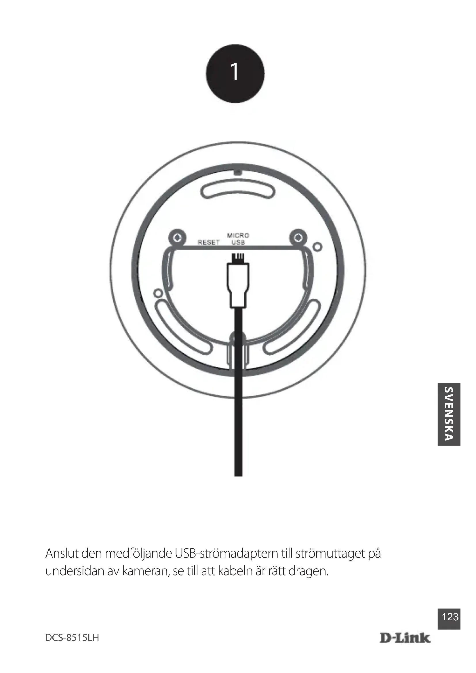 Anslut den medföljande USB-strömadaptern till strömuttaget på undersidan av kameran, se till att kabeln är rätt dragen.DCS-8515LH
