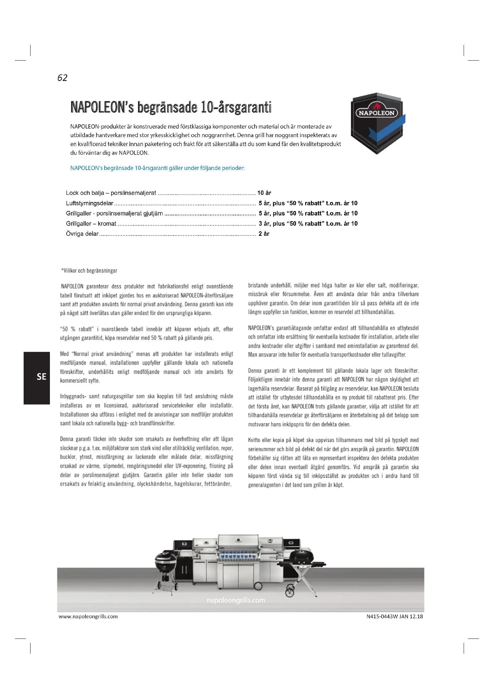 - *Villkor och begränsningar NAPOLEON garanterar dess produkter mot fabrikationsfel enligt ovanstående tabell förutsatt att inköpet gjordes hos en auktoriserad NAPOLEON-återförsäljare samt att produkten använts för normal privat användning. Denna garanti kan inte på något sätt överlåtas utan gäller endast för den ursprungliga köparen. “50 % rabatt” i ovanstående tabell innebär att köparen erbjuds att, efter utgången garantitid, köpa reservdelar med 50 % rabatt på gällande pris. Med “Normal privat användning” menas att produkten har installerats enligt medföljande manual, installationen uppfyller gällande lokala och nationella föreskrifter, underhållits enligt medföljande manual och inte använts för kommersiellt syfte. Inbyggnads- samt naturgasgrillar som ska kopplas till fast anslutning måste installeras av en licensierad, auktoriserad servicetekniker eller installatör. Installationen ska utföras i enlighet med de anvisningar som medföljer produkten samt lokala och nationella bygg- och brandföreskrifter. Denna garanti täcker inte skador som orsakats av överhettning eller att lågan slocknar p.g.a. t.ex. miljöfaktorer som stark vind eller otillräcklig ventilation, repor, bucklor, ytrost, missfärgning av lackerade eller målade delar, missfärgning orsakad av värme, slipmedel, rengöringsmedel eller UV-exponering, flisning på delar av porslinsemaljerat gjutjärn. Garantin gäller inte heller skador som orsakats av felaktig användning, olyckshändelse, hagelskurar, fettbränder, bristande underhåll, miljöer med höga halter av klor eller salt, modifieringar, missbruk eller försummelse. Även att använda delar från andra tillverkare upphäver garantin. Om delar inom garantitiden blir så pass defekta att de inte längre uppfyller sin funktion, kommer en reservdel att tillhandahållas. NAPOLEON’s garantiåtagande omfattar endast att tillhandahålla en utbytesdel och omfattar inte ersättning för eventuella kostnader för installation, arbete eller andra kostnader eller utgifter i samband med ominstallation av garanterad del. Man ansvarar inte heller för eventuella transportkostnader eller tullavgifter. Denna garanti är ett komplement till gällande lokala lager och föreskrifter. Följaktligen innebär inte denna garanti att NAPOLEON har någon skyldighet att lagerhålla reservdelar. Baserat på tillgång av reservdelar, kan NAPOLEON besluta att istället för utbytesdel tillhandahålla en ny produkt till rabatterat pris. Efter det första året, kan NAPOLEON trots gällande garantier, välja att istället för att tillhandahålla reservdelar ge återförsäljaren en återbetalning på det belopp som motsvarar hans inköpspris för den defekta delen. Kvitto eller kopia på köpet ska uppvisas tillsammans med bild på typskylt med serienummer och bild på defekt del när det görs anspråk på garantin. NAPOLEON förbehåller sig rätten att låta en representant inspektera den defekta produkten eller delen innan eventuell åtgärd genomförs. Vid anspråk på garantin ska köparen först vända sig till inköpsstället av produkten och i andra hand till generalagenten i det land som grillen är köpt. napoleongrills.com NAPOLEON’s begränsade 10-årsgaranti NAPOLEON-produkter är konstruerade med förstklassiga komponenter och material och är monterade av utbildade hantverkare med stor yrkesskicklighet och noggrannhet. Denna grill har noggrant inspekterats av en kvalificerad tekniker innan paketering och frakt för att säkerställa att du som kund får den kvalitetsprodukt du förväntar dig av NAPOLEON. NAPOLEON’s begränsade 10-årsgaranti gäller under följande perioder: Lock och balja – porslinsemaljerat p. 10
