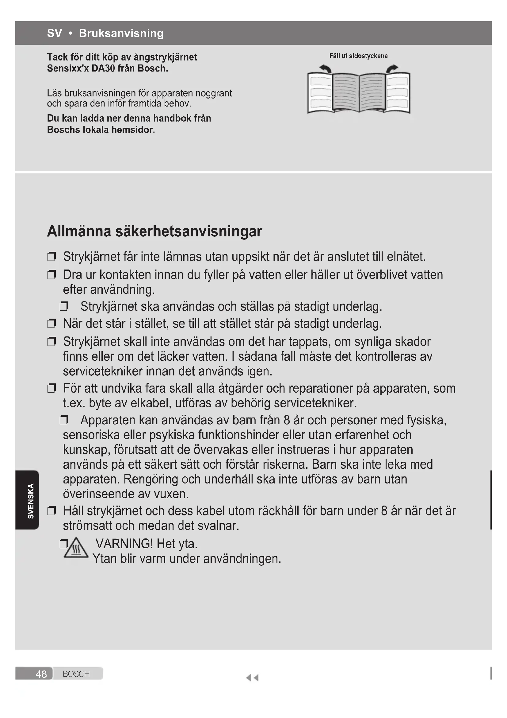 VARNING! Het yta. Ytan blir varm under användningen. SV • Bruksanvisning Tack för ditt köp av ångstrykjärnet Sensixx'x DA30 från Bosch. Läs bruksanvisningen för apparaten noggrant och spara den inför framtida behov. Du kan ladda ner denna handbok från Boschs lokala hemsidor. Fäll ut sidostyckena49 B O S C H